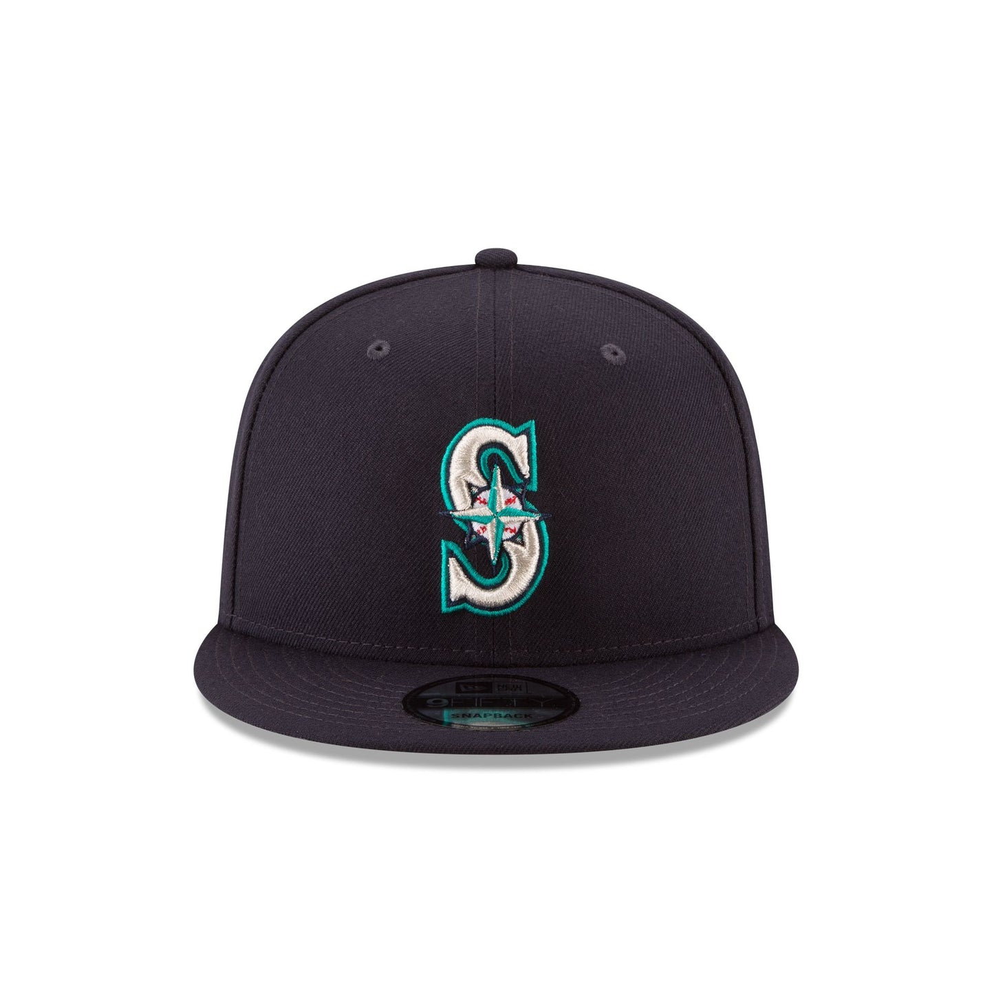 The Seattle Mariners 2025 Postseason Side Patch 9FIFTY Snapback features an embroidered Mariners logo at the front panels with a 2025 Postseason patch at the right-wear side and an adjustable snapback closure at the rear.