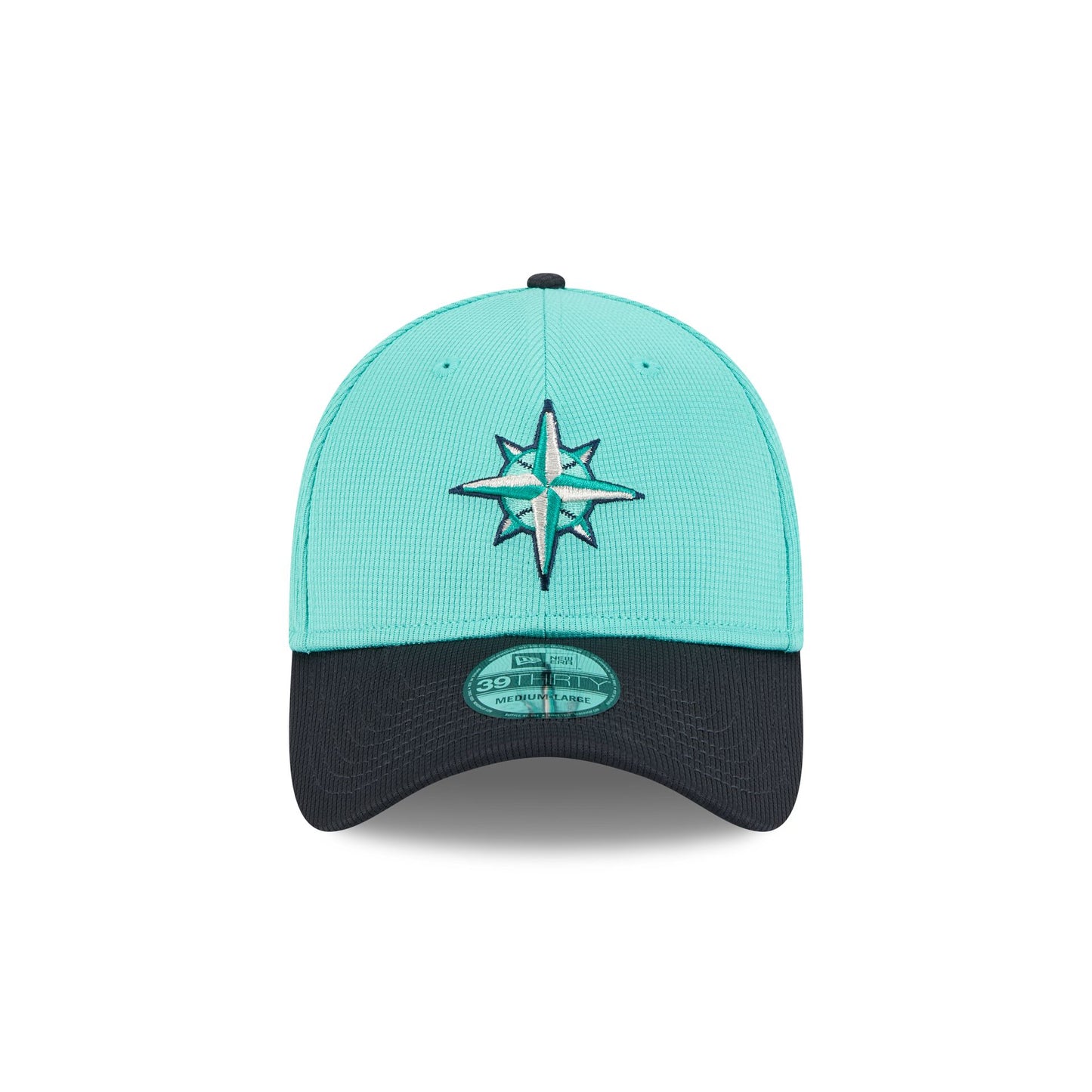 The Seattle Mariners 2025 Spring Training 39THIRTY Stretch Fit Cap features an embroidered Mariners logo at the front panels with a matching team wordmark at the rear. Additional details include a pivot knit fabrication with a 2025 Spring Training patch at the right-wear side and a black undervisor.