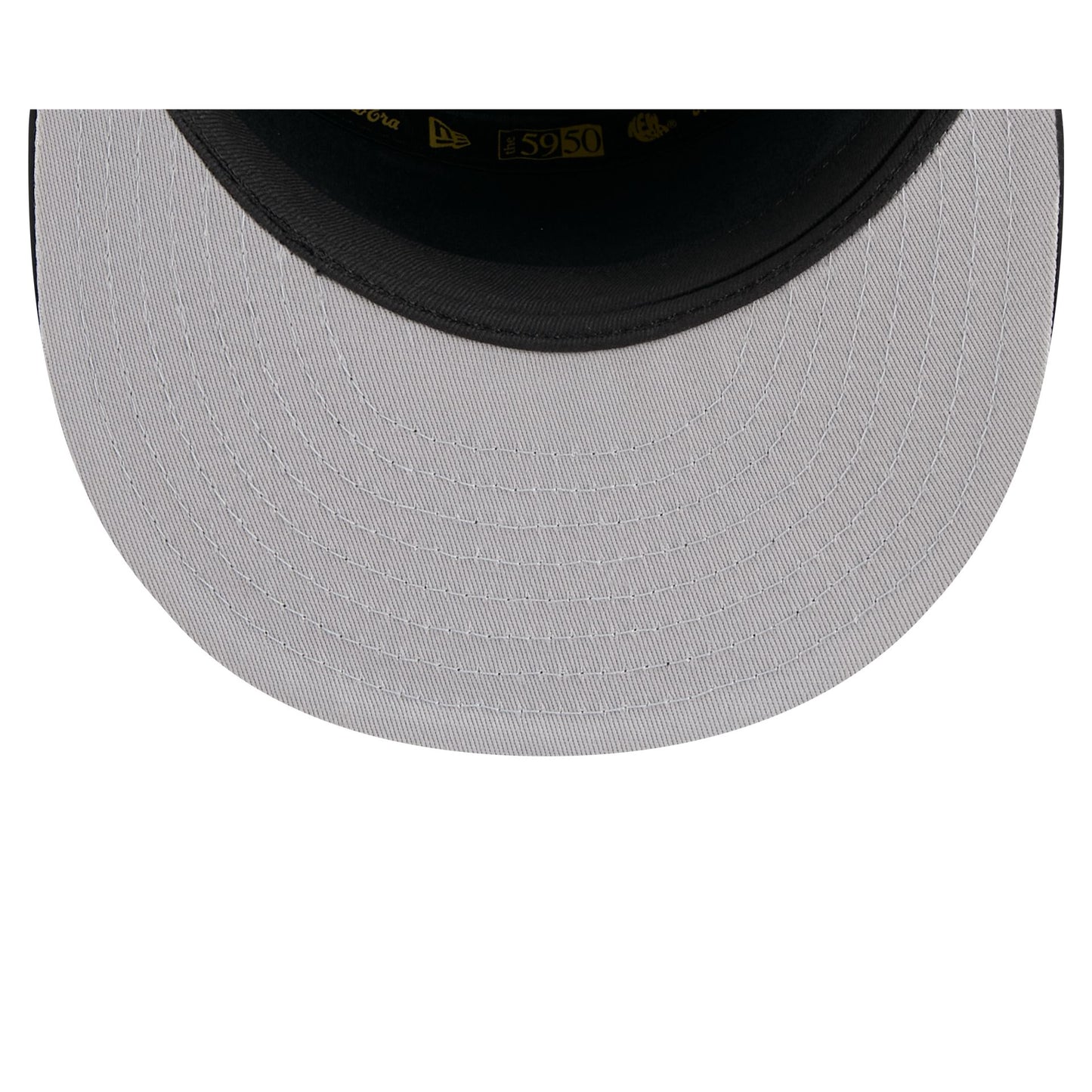 The Seattle Mariners Black Poly Rope 59FIFTY Split Panel Fitted Cap features a woven Mariners logo at the front panels with a matching MLB Batterman embroidered at the rear. Additional details include a rope at the visor and a gray undervisor.