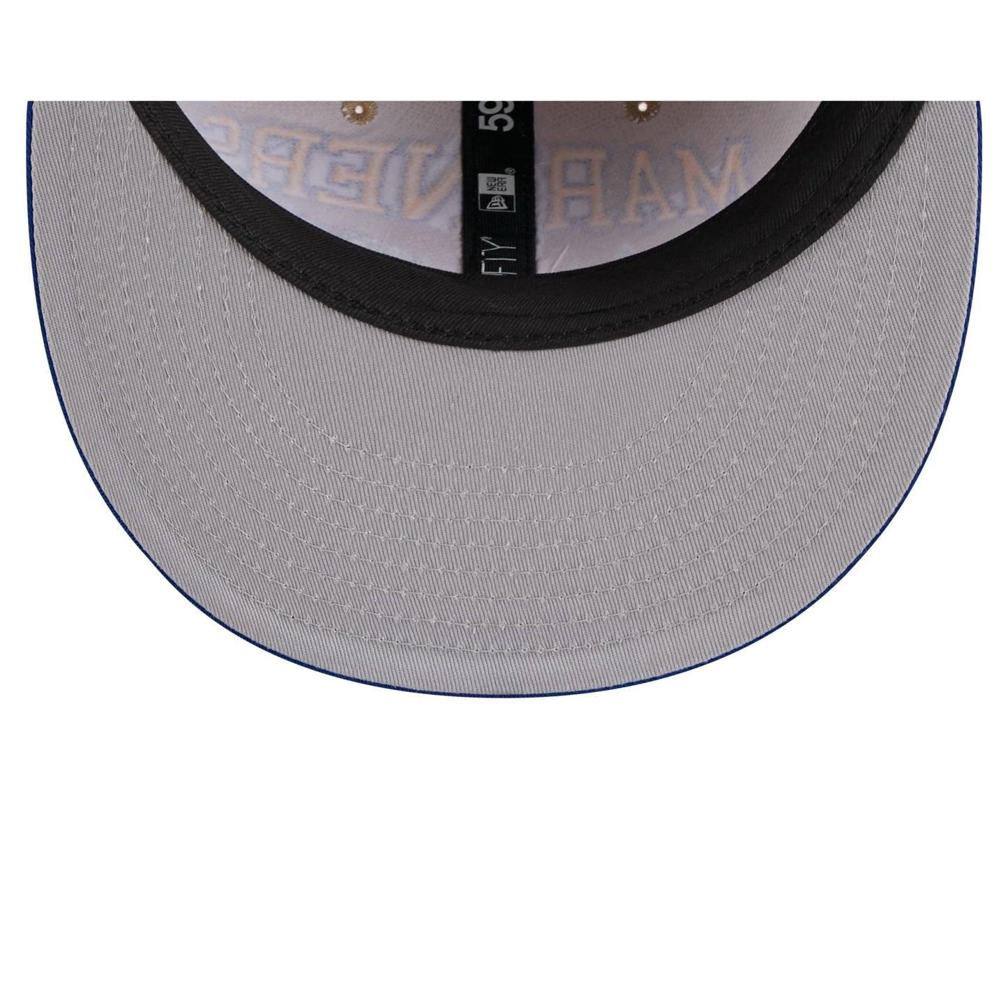 The Seattle Mariners Camel Retro Crown 59FIFTY Fitted Cap features an embroidered Mariners Cooperstown wordmark, logo, and league patch at the front panels. Additional details include an MLB Batterman logo at the rear and a gray undervisor.