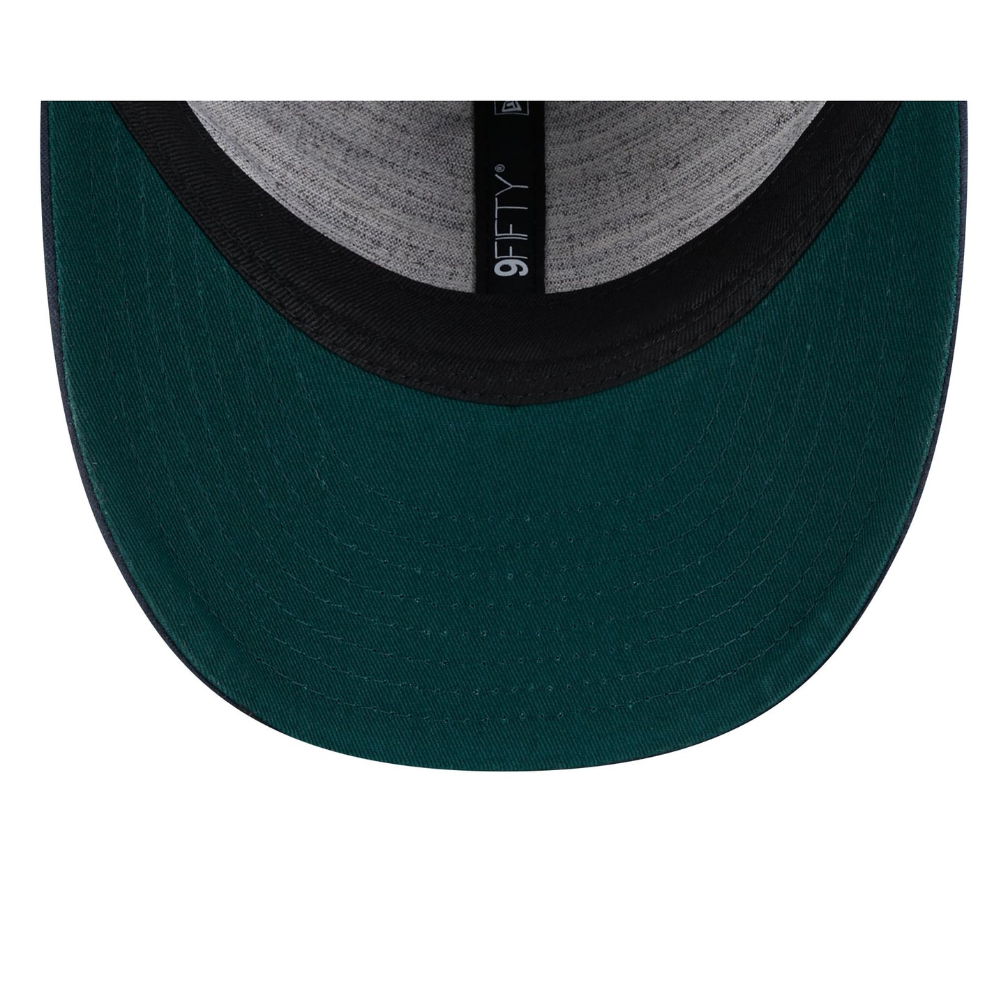 The Seattle Mariners Canvas Felt Retro Crown 9FIFTY Strapback Cap features an embroidered Mariners logo at the front panels with a matching MLB Batterman logo at the right rear. Additional details include an adjustable D-Ring closure at the rear and a green undervisor.