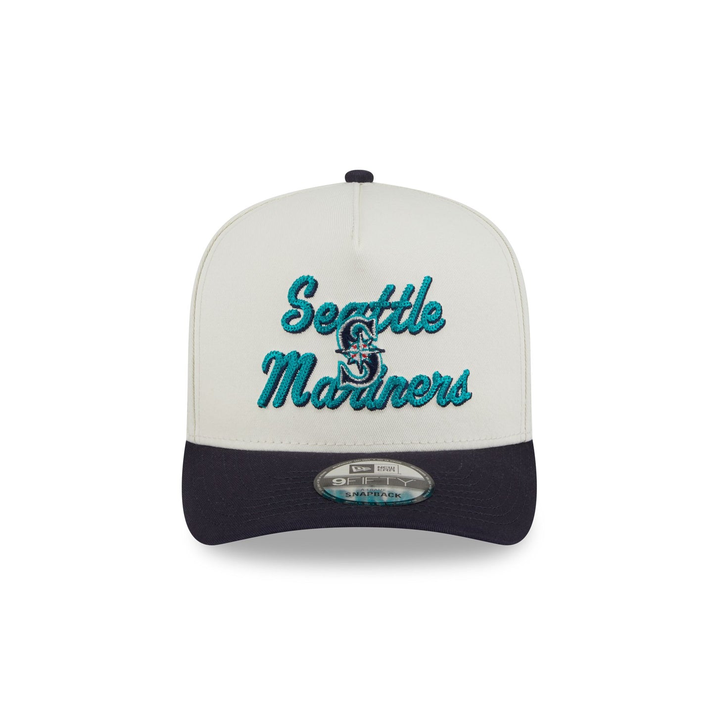 The Seattle Mariners Chainstitch 9FIFTY A-Frame Snapback features a chainstitch Mariners logo and script wordmark at the front panels with a snapback closure at the rear and a gray undervisor.