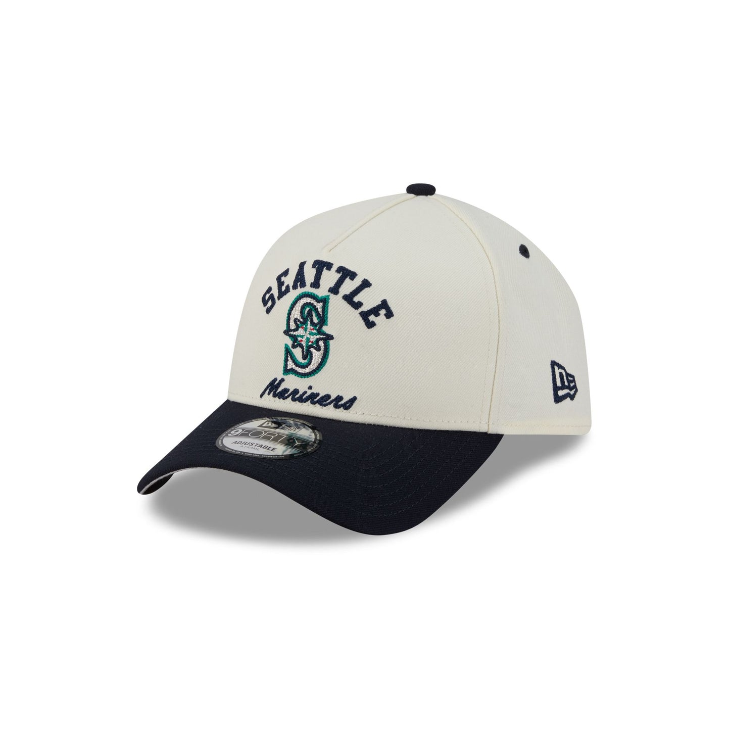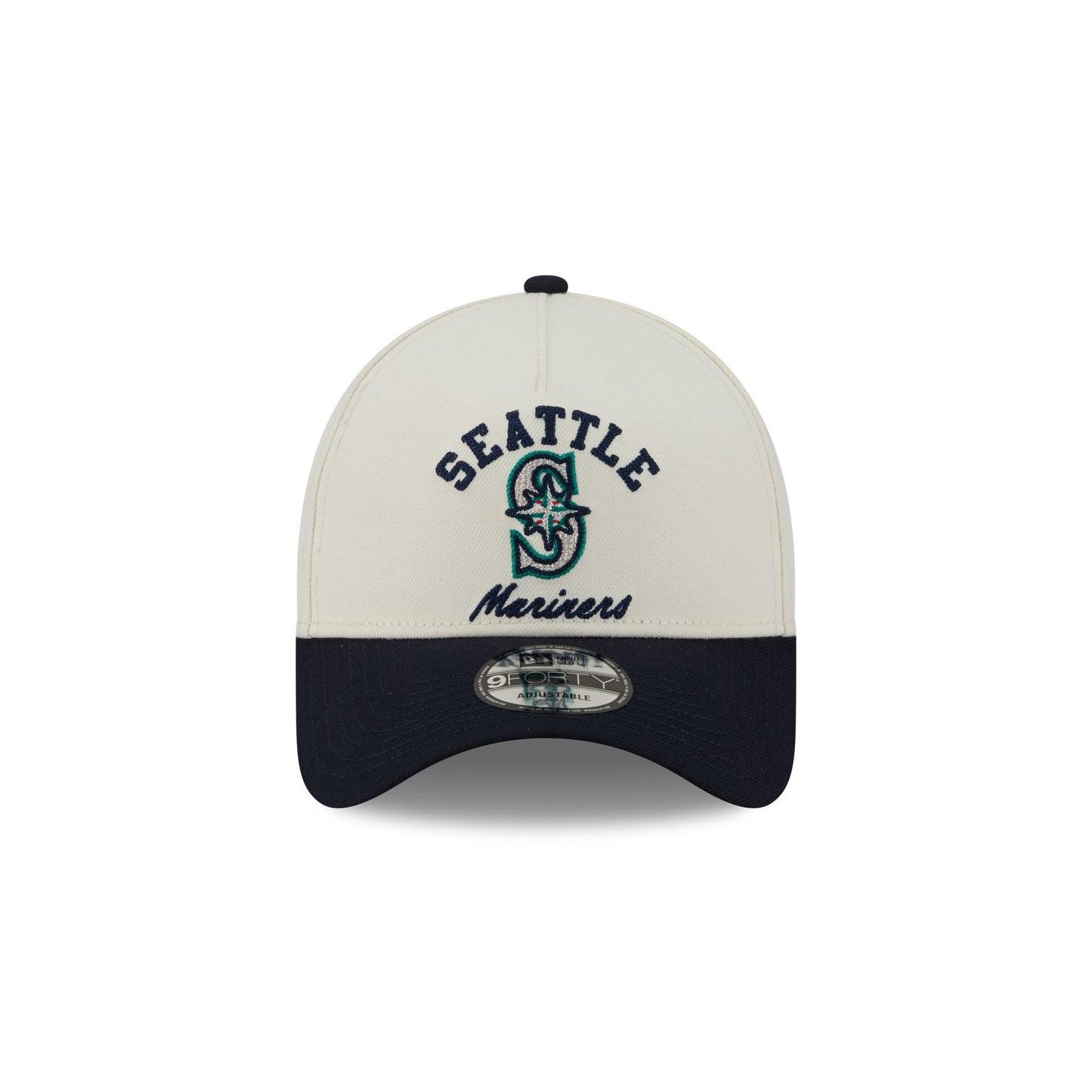 The Seattle Mariners Chrome White Arched 9FORTY A-Frame Snapback features an embroidered Mariners arched logo graphic at the front panels with a team graphic at the right-wear side. Additional details include the establishment date above an adjustable snapback closure at the rear and a gray undervisor.