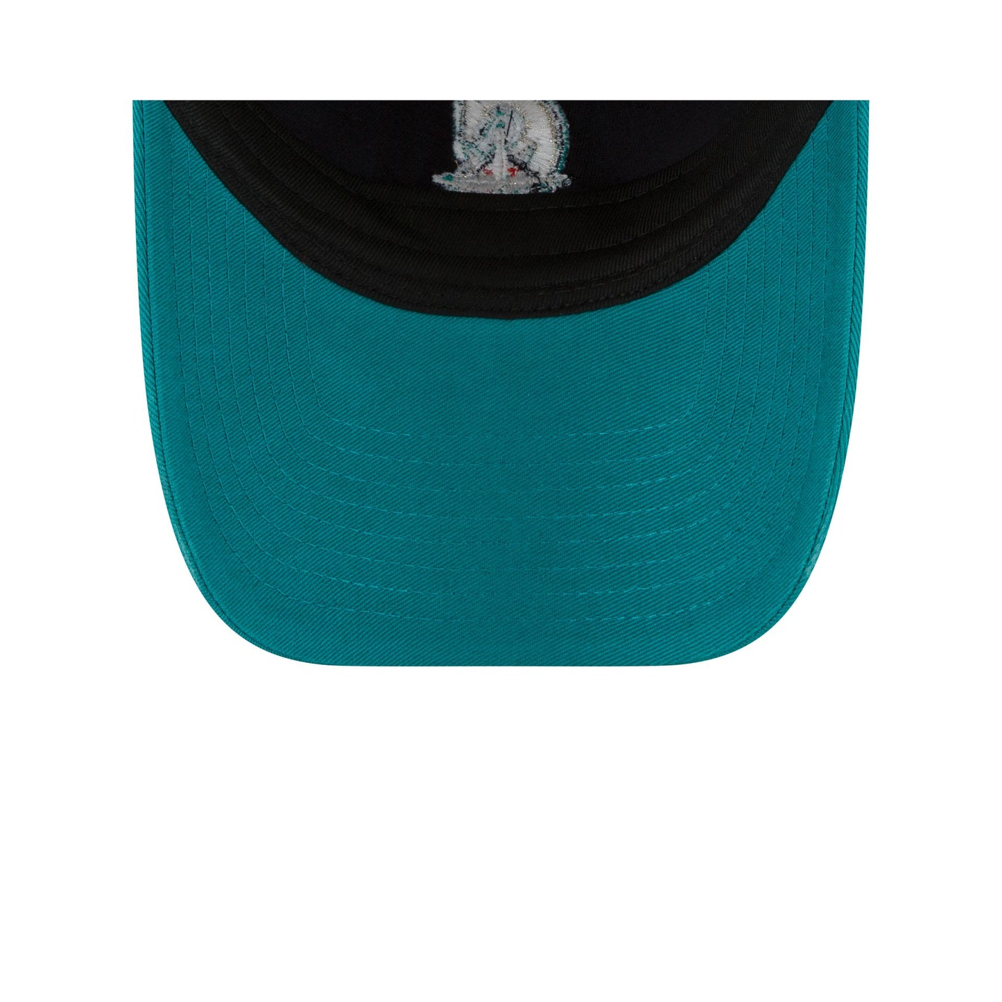 The Seattle Mariners Core Classic Alternate 9TWENTY Adjustable Cap features an embroidered Mariners logo at the front panels with a woven tab displaying the team logo on a D-Ring closure at the rear.