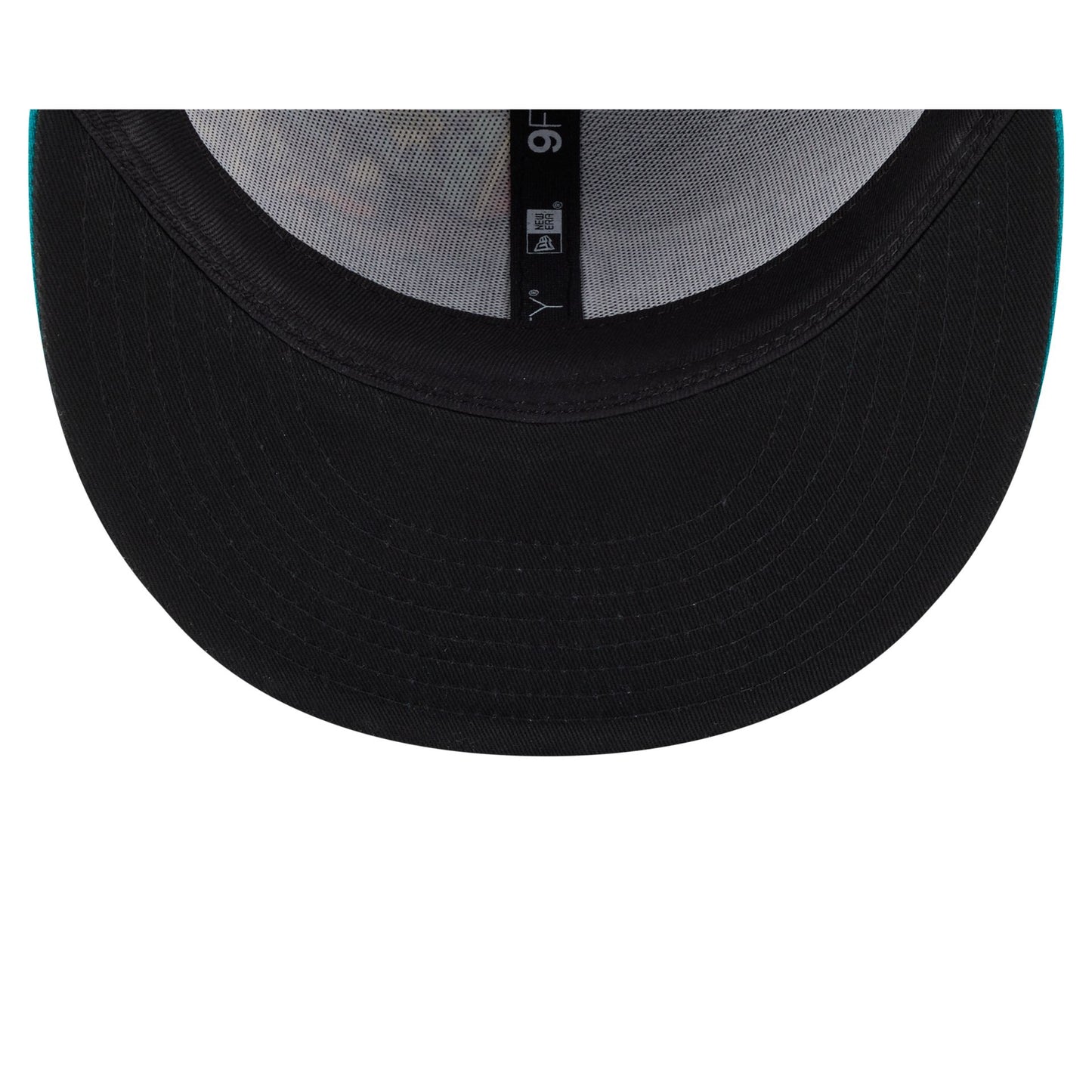 The Seattle Mariners Diamond Hero Edition 9FIFTY Snapback features an embroidered Mariners onomatopoeia pop wordmark at the front panels with baseball comic book prints at the front and back panel. Additional details include a ZOOM! wordmark at the left-wear side, the MLB Batterman logo above a snapback closure at the rear, and a gray undervisor.
