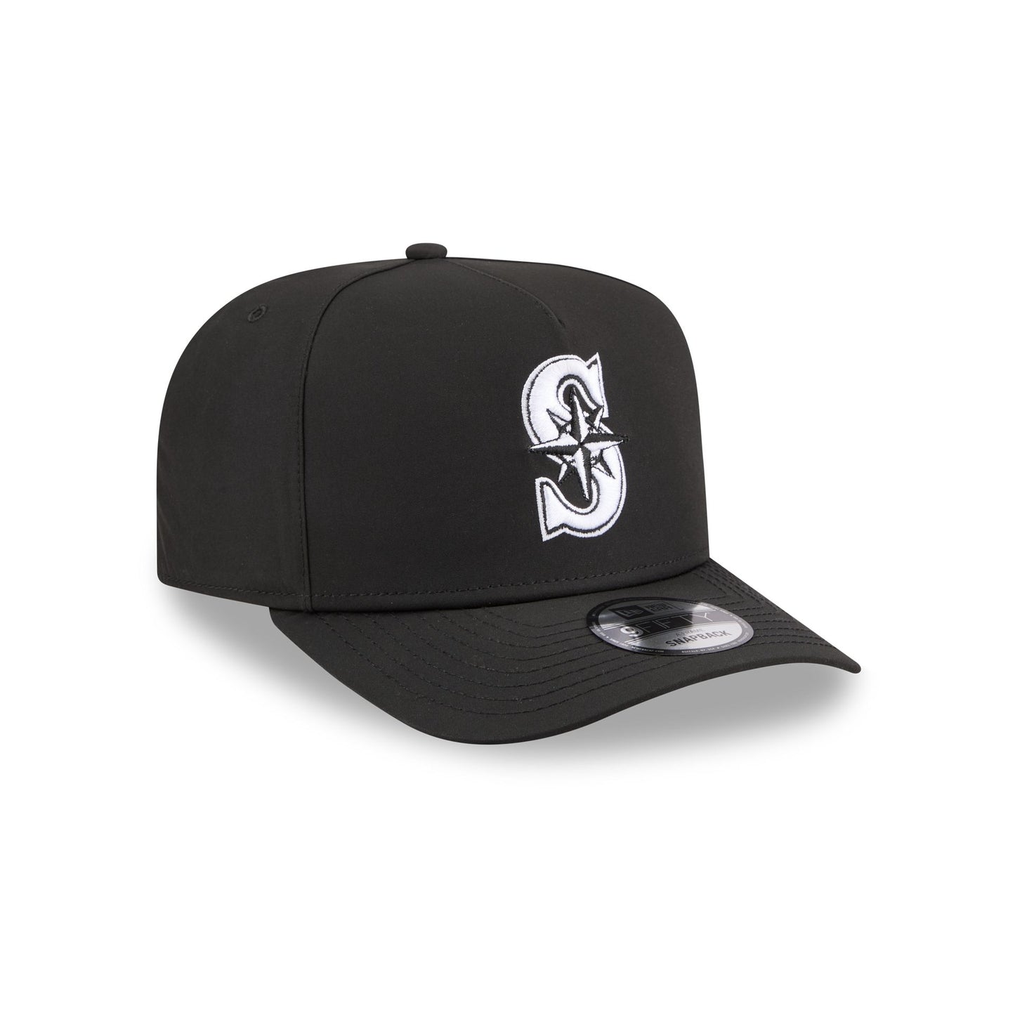The Seattle Mariners GORE-TEX Black 9FIFTY A-Frame Snapback features an embroidered white Mariners logo at the front panels with a metallic sheen silicone New Era Flag logo and GORE-TEX logo at the left-wear side. Additional details include an adjustable snapback closure at the rear, a gray undervisor, and a polyester fabrication throughout the cap. It is waterproof, breathable, and lightweight.
