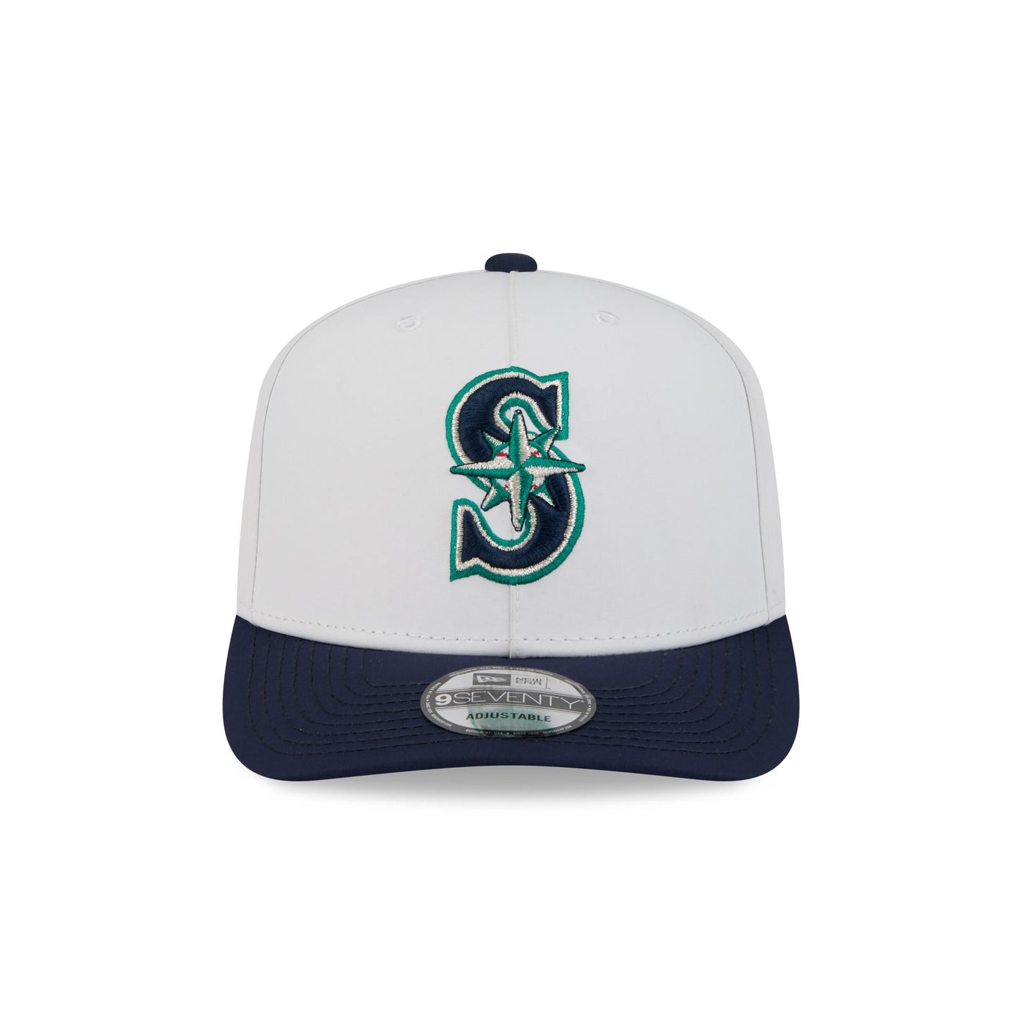 The Seattle Mariners GORE-TEX White 9SEVENTY Stretch-Snap features an embroidered Mariners logo at the front panels with a metallic sheen silicone New Era Flag logo and GORE-TEX logo at the left-wear side. Additional details include an adjustable snapback closure at the rear, a gray undervisor, and a polyester fabrication throughout the cap. It is waterproof, breathable, and lightweight.