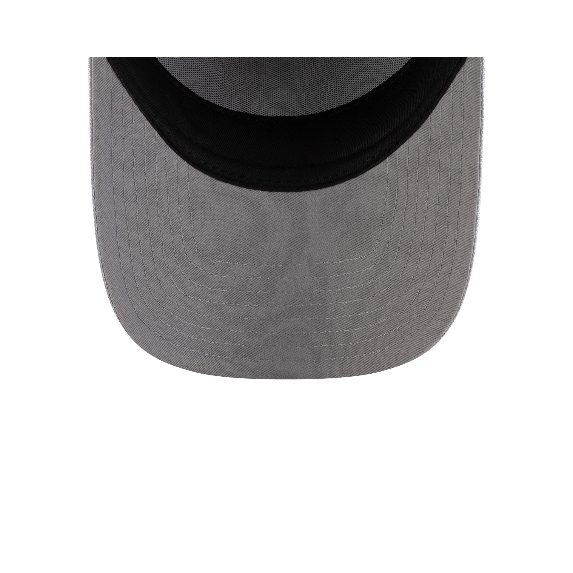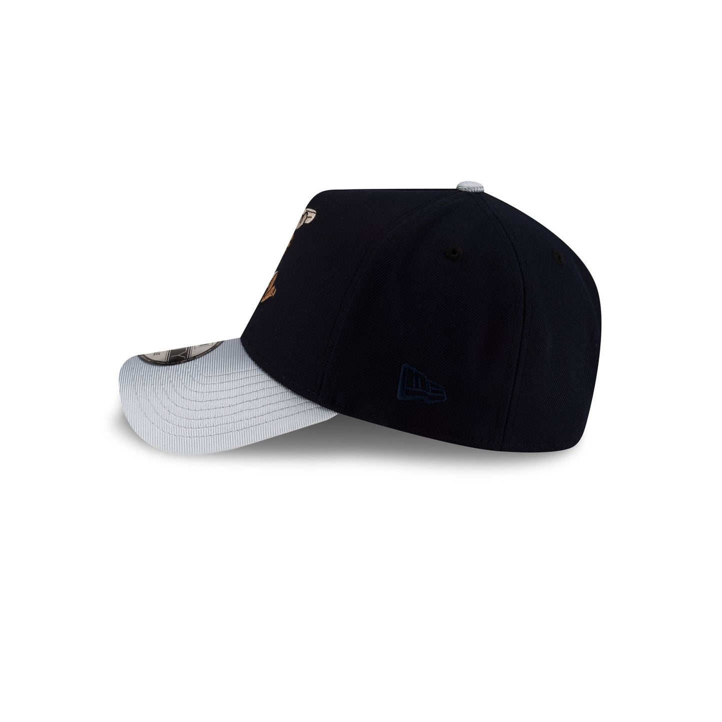 The Seattle Mariners Mascot Navy 9FORTY A-Frame Snapback features an embroidered Mariners mascot at the front panels with a 25th Anniversary patch at the right-wear side. Additional details include a snapback closure at the rear and a gray undervisor.