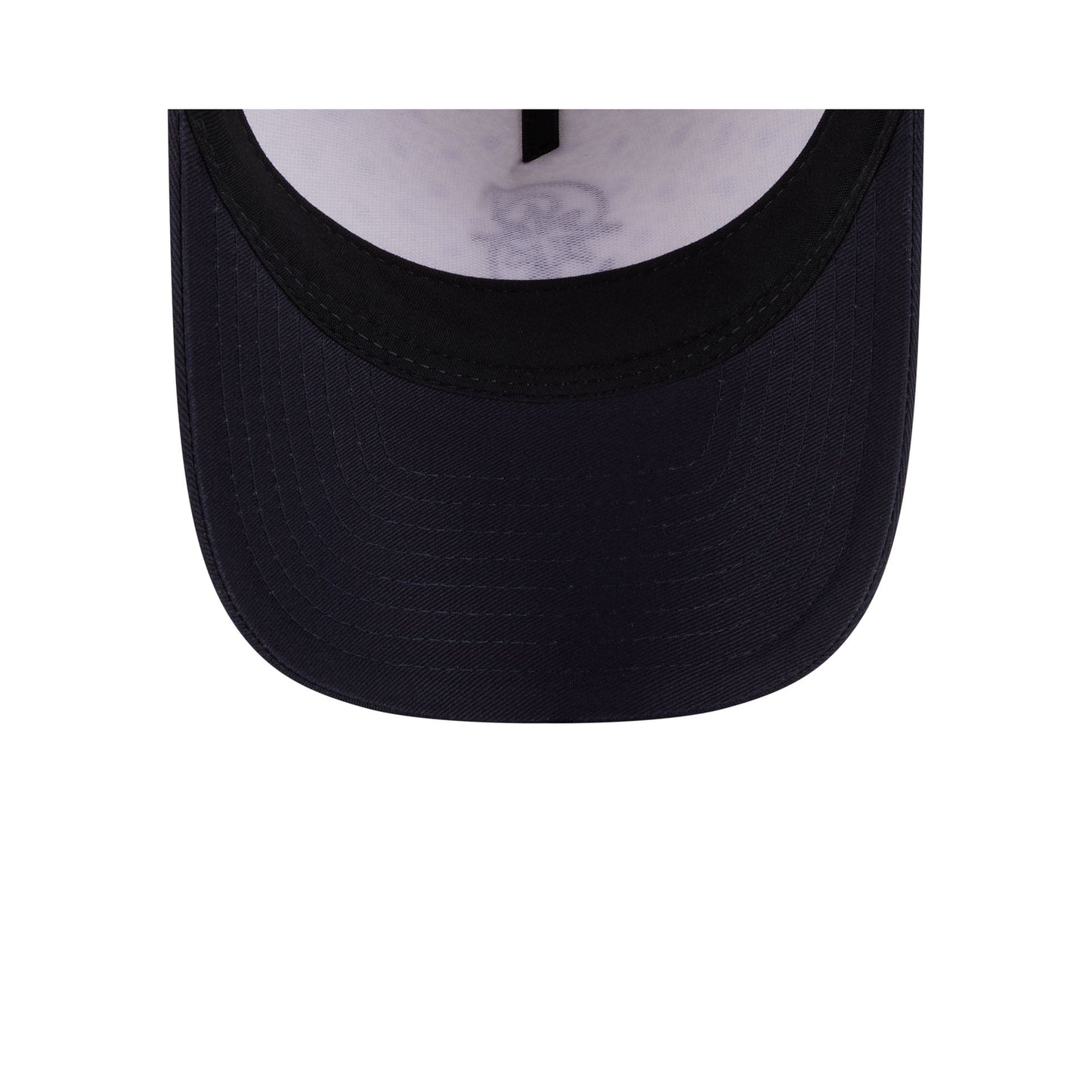 The Seattle Mariners Micro Print 9FORTY M-Crown A-Frame Adjustable Cap features an embroidered Mariners logo at the front panels against a specialty Japanese milled woven fabric from Three Looms Japan Fabrics.. Additional details include an adjustable D-Ring closure at the rear.