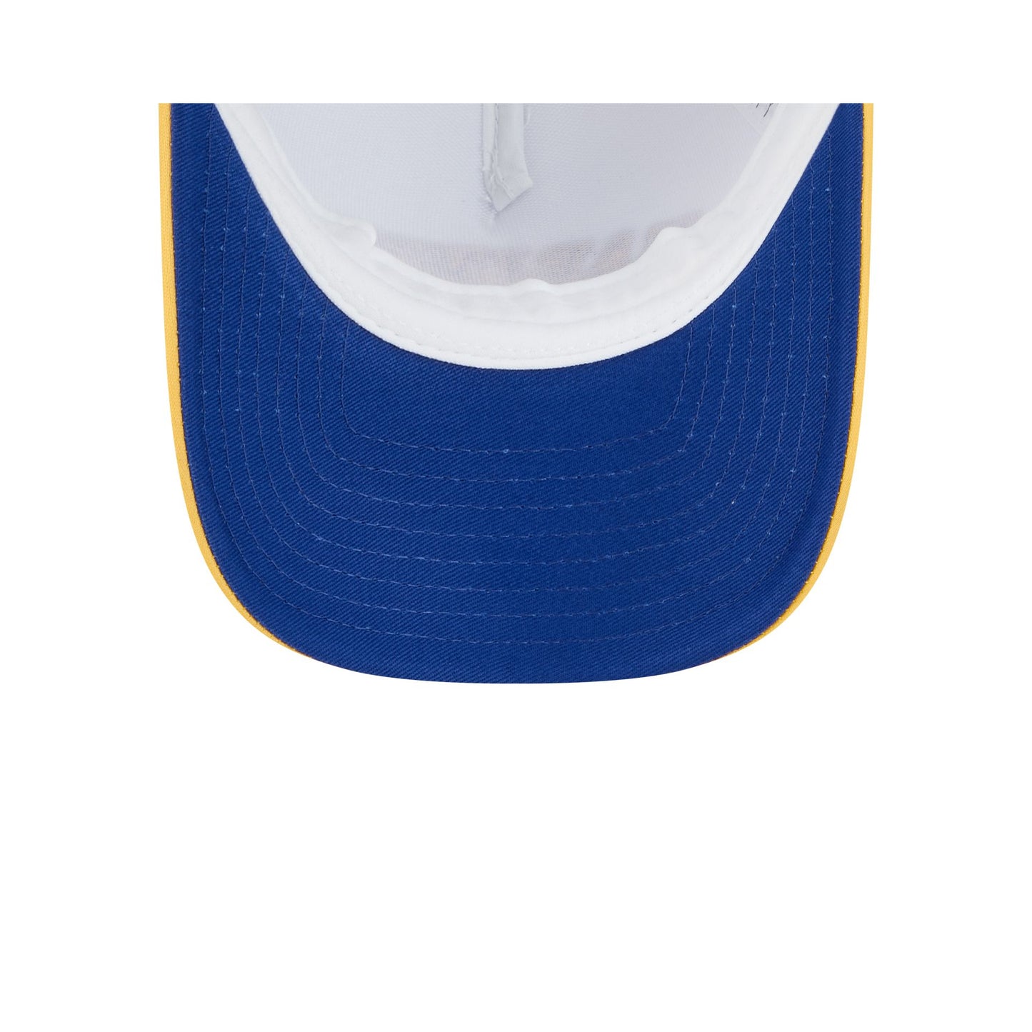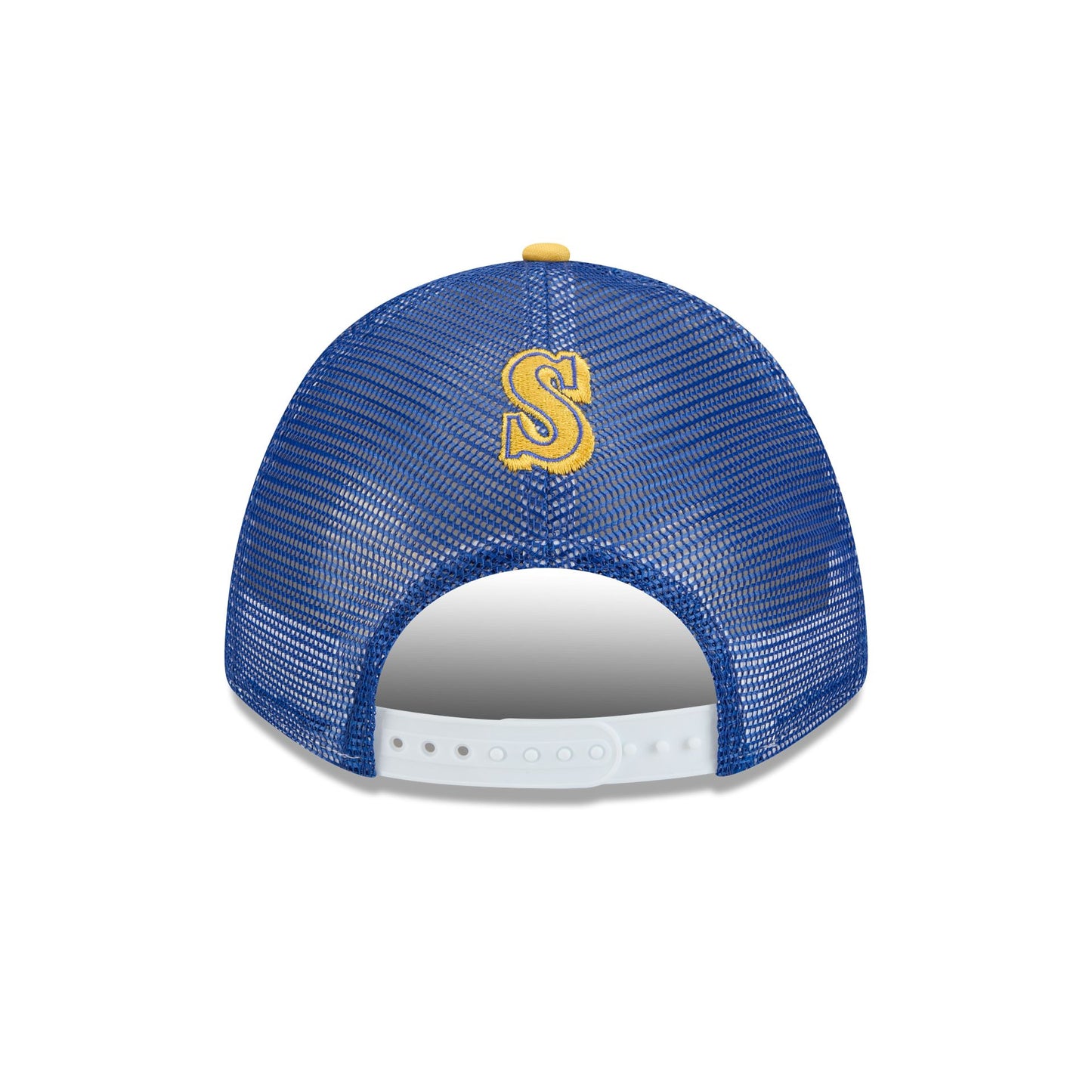 The Seattle Mariners Summer Derby 9FORTY M-Crown A-Frame Snapback features an embroidered Mariners Cooperstown wordmark at the front panel with a 1979 All-Star Game patch at the right-wear side. Additional details include a team logo above an adjustable snapback closure at the rear with a yellow visor and a blue undervisor.