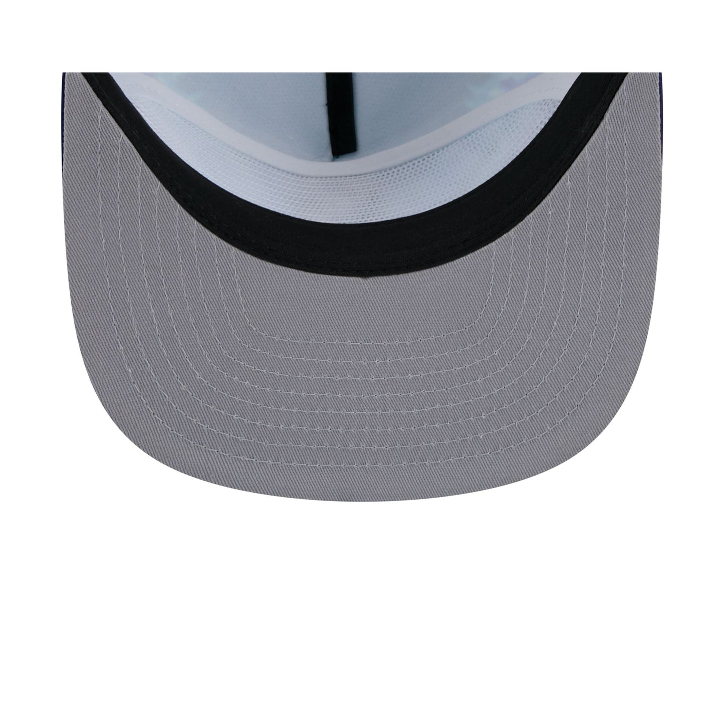 The Seattle Mariners Tie-Dye Golfer features an embroidered Mariners logo at the front panels against a tie-dye front panel. Additional details include a snapback closure at a mesh rear and a gray undervisor.