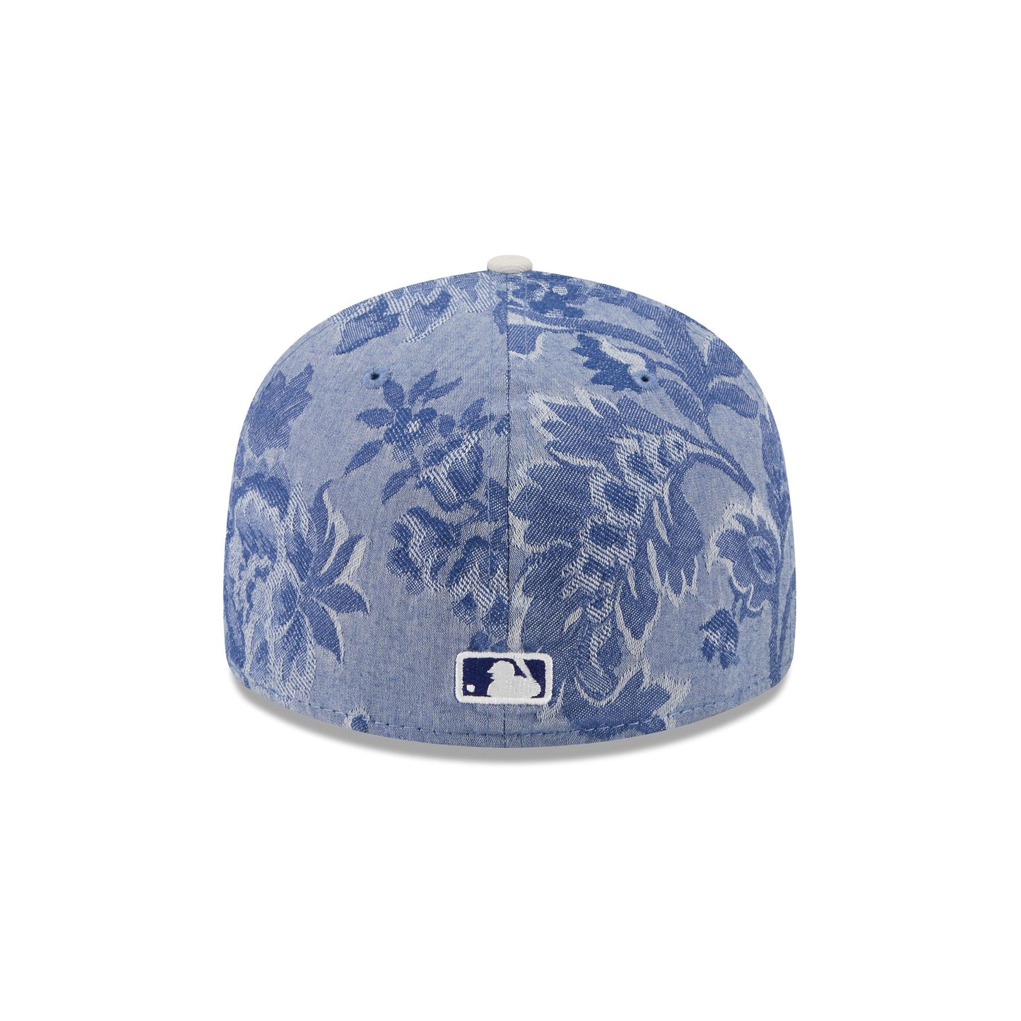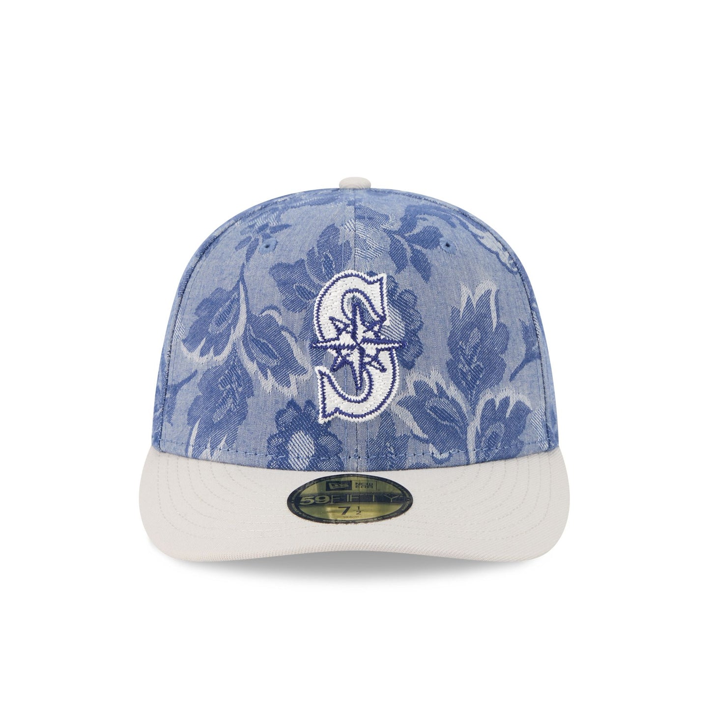 The Seattle Mariners Two-Tone Denim 59FIFTY Fitted Cap features an embroidered Mariners logo at the front panels against a specialty Japanese milled gobline chambray fabrication from Three Looms Japan Fabrics throughout the cap. Additional details include an MLB Batterman logo at the rear and a gray undervisor.