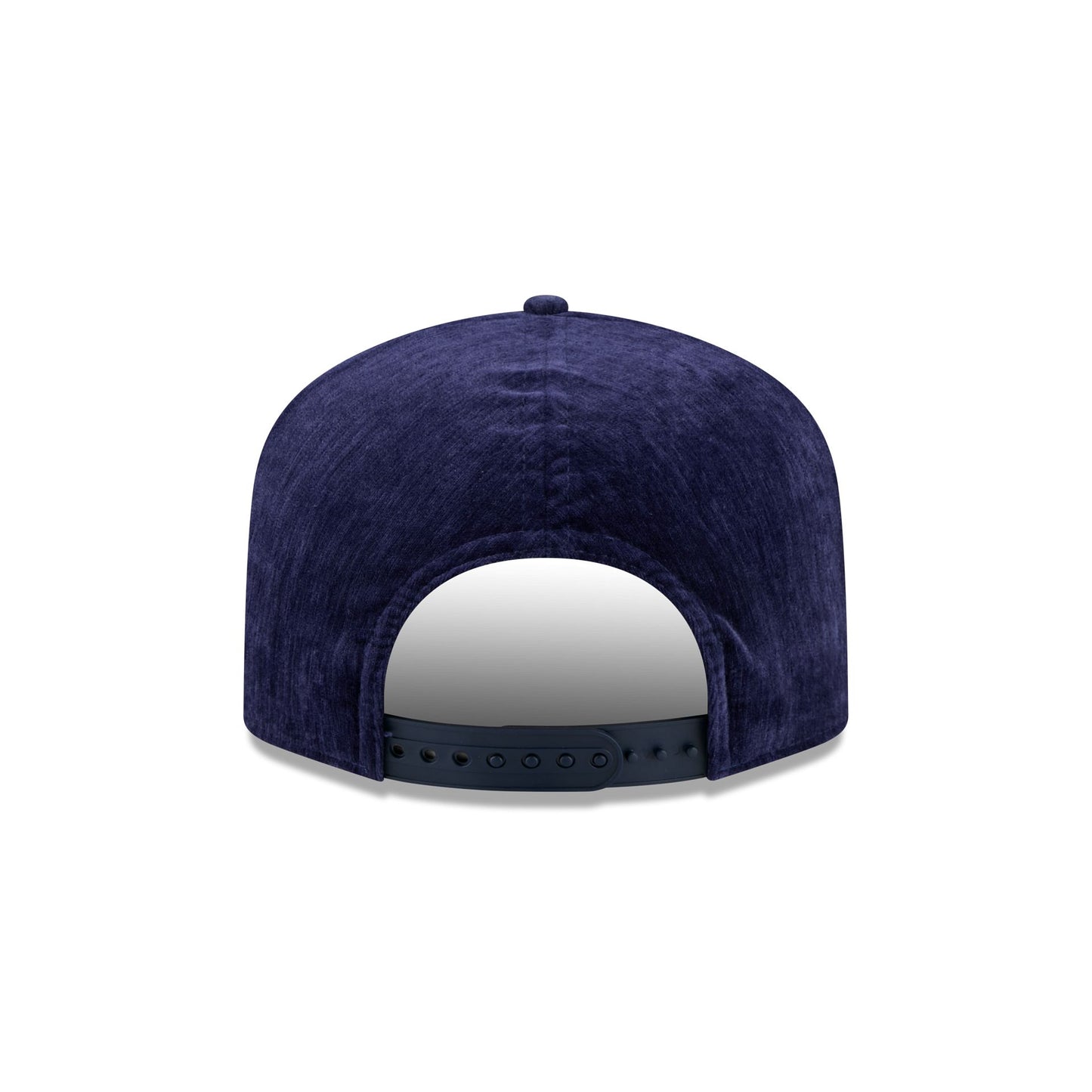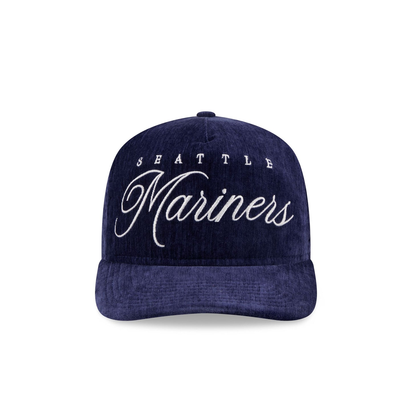 The Seattle Mariners Velvet Team Script 19TWENTY Adjustable Cap features an embroidered Mariners wordmark script at the front panels with a team logo at the right-wear side. Additional details include an adjustable snapback closure at the rear and a gray undervisor.