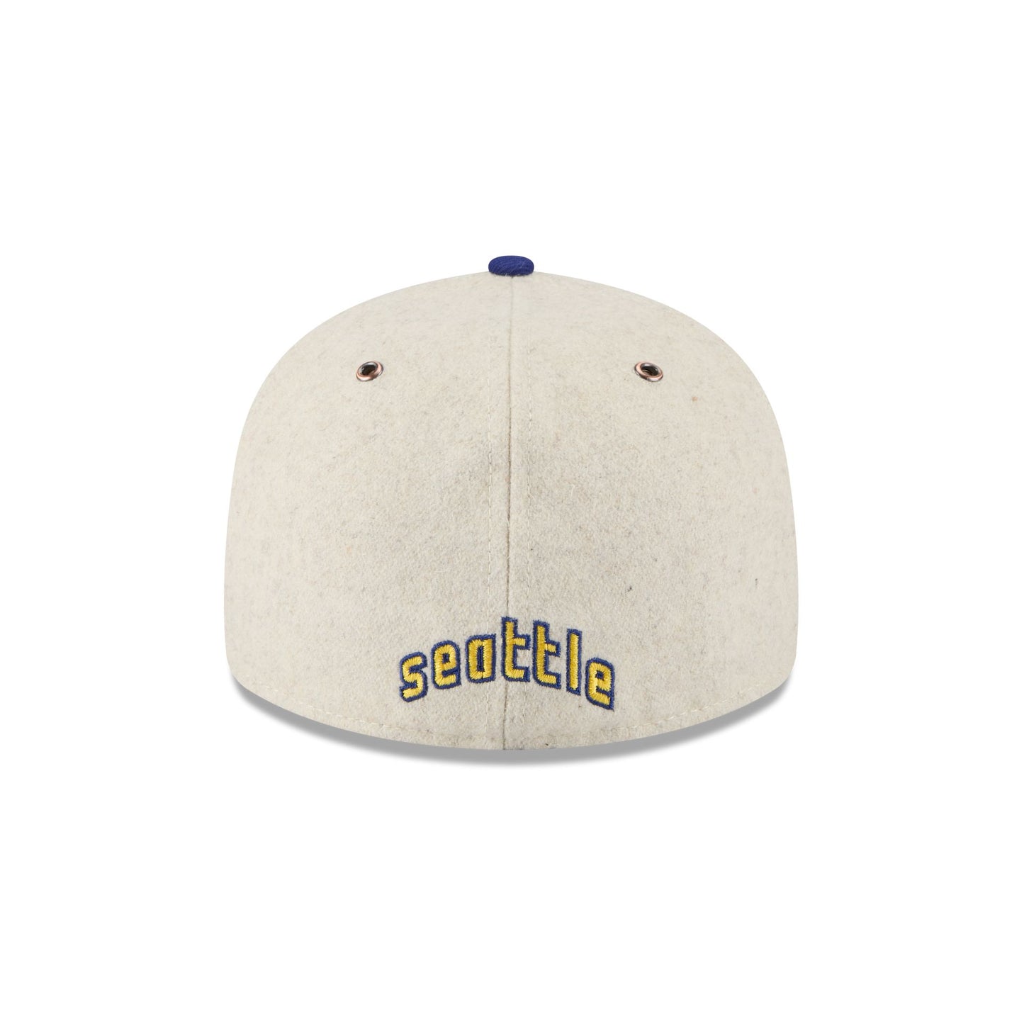 The Seattle Pilots Wool Letterman Retro Crown 59FIFTY Fitted Cap features an embroidered loop Pilots logo at the front panels and an additional logo at the rear. Additional details include a wool fabrication throughout the cap and a gray undervisor.
