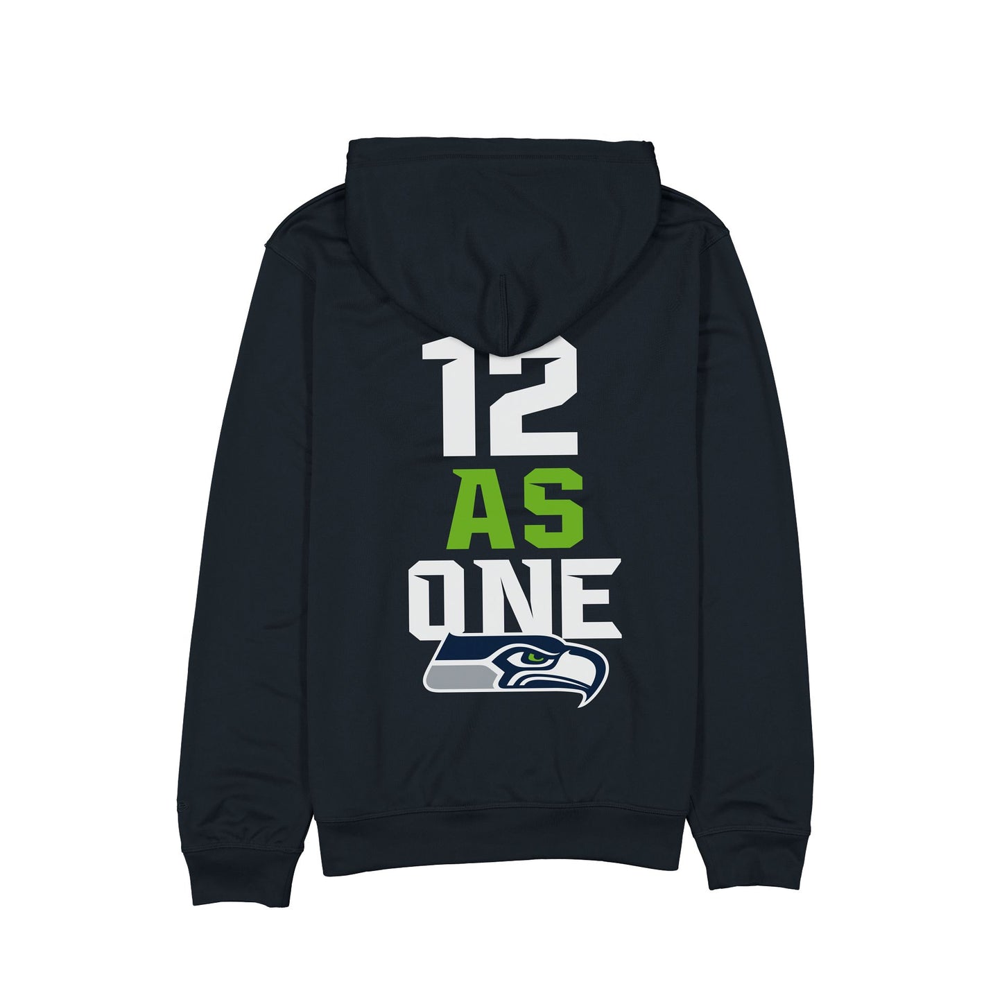The Seattle Seahawks 12 as One Hoodie features a screen-printed Seahawks 12s graphic at the front with a 12 as One graphic at the rear. Additional details include kangaroo pockets and adjustable drawstrings at the hood.