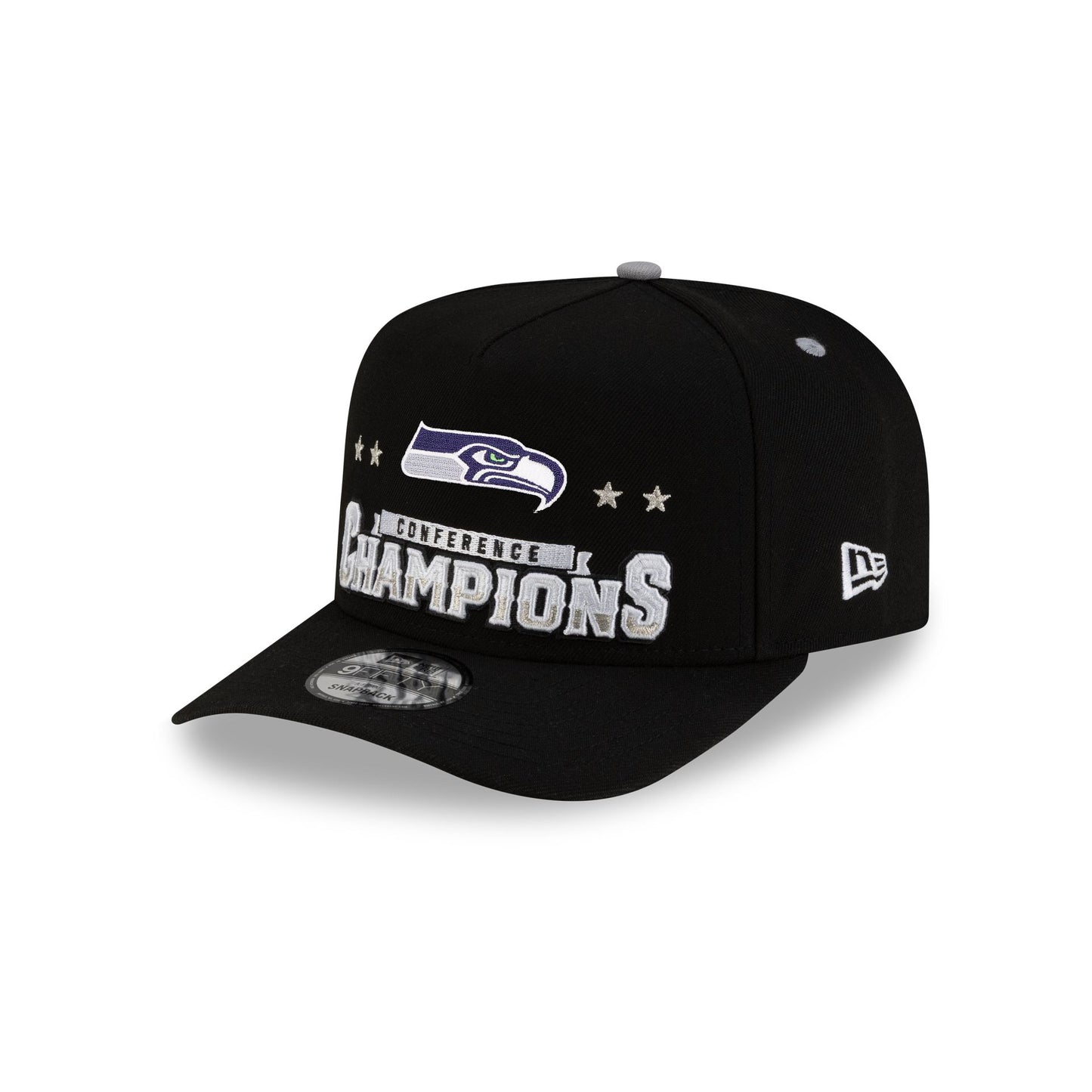 The Seattle Seahawks 2025-2026 Conference Champions Locker Room 9FIFTY A-Frame Snapback features an embroidered Seahawks Conference Champions graphic at the front panels with a Super Bowl LX patch at the right-wear side. Additional details include the NFL Shield logo above an adjustable snapback closure at the rear and a gray undervisor.