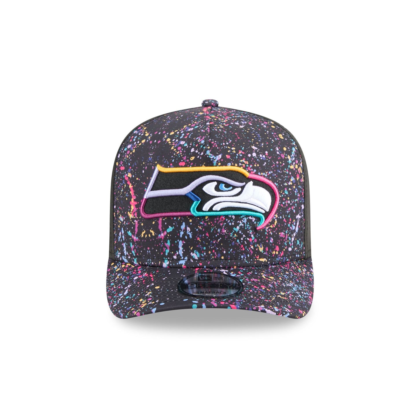 The Seattle Seahawks 2025 Crucial Catch 9FIFTY A-Frame Snapback features an embroidered Seahawks logo at the front paint splatter panels with a woven NFL Shield tag above a snapback closure at the rear. Additional details include a Crucial Catch Intercept Cancer patch at the right-wear side and a black undervisor.
