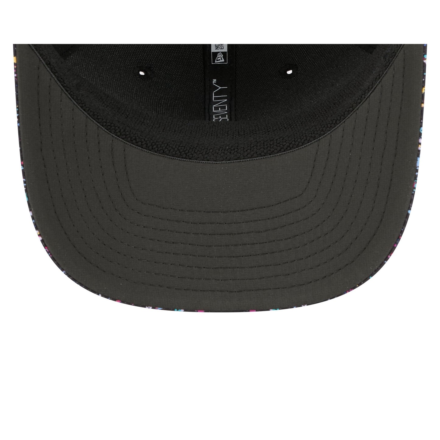 The Seattle Seahawks 2025 Crucial Catch 9SEVENTY Trucker features an embroidered Seahawks logo at the front paint splatter panels with a woven NFL Shield tag above a snapback closure at the rear. Additional details include a Crucial Catch Intercept Cancer patch at the right-wear side with performance mesh rear panels and a black undervisor.