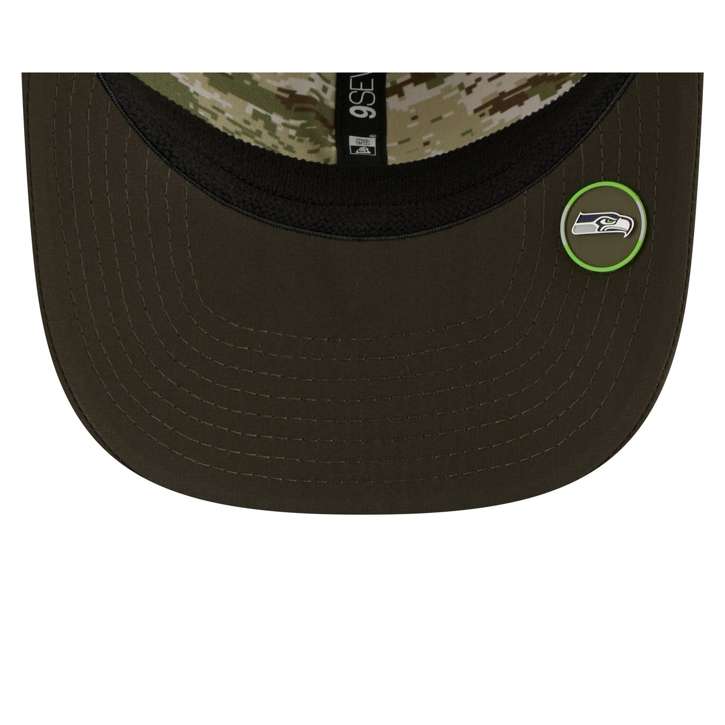 The Seattle Seahawks 2025 Salute to Service 9SEVENTY Trucker features an embroidered Seahawks logo at the front panels with the official NFL Salute to Service patch above a snapback closure at the rear. Additional details include an American flag patch at the right-wear side with a silicone team logo patch at a dark green undervisor and a digi camo interior fabrication.