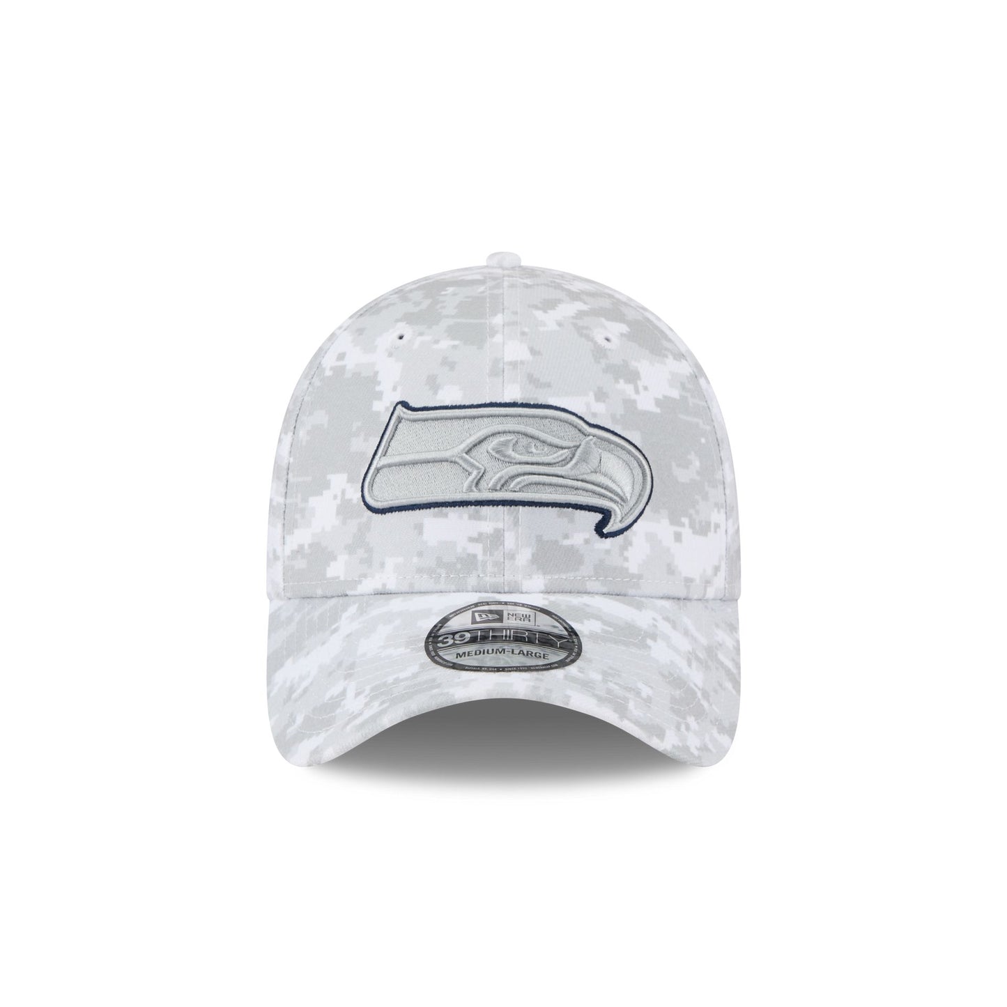 The Seattle Seahawks 2025 Salute to Service Fan Gear 39THIRTY Stretch Fit Cap features an embroidered Seahawks logo at the front panels with the official NFL Salute to Service patch at the rear, an American flag patch at the right-wear side, and a team color undervisor.