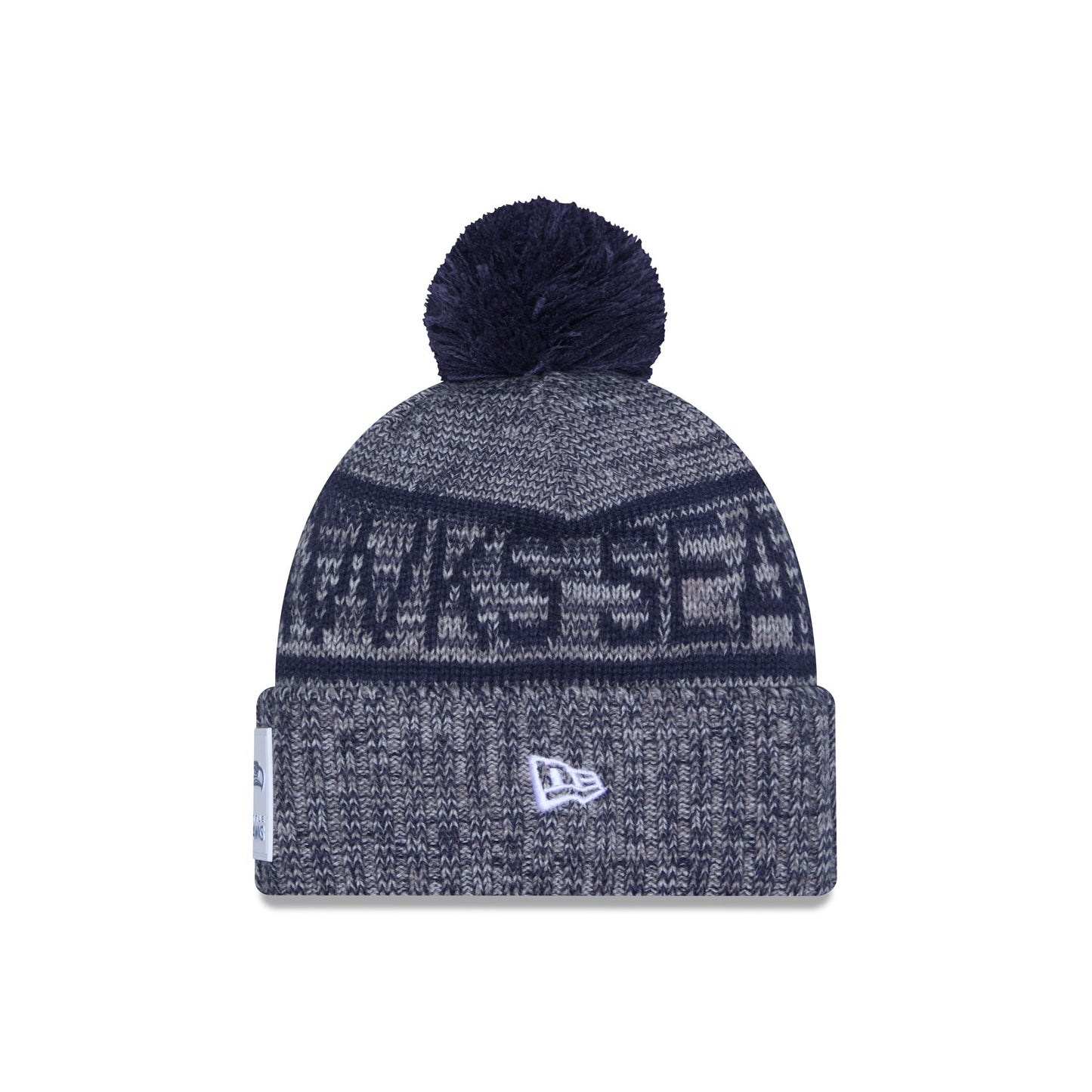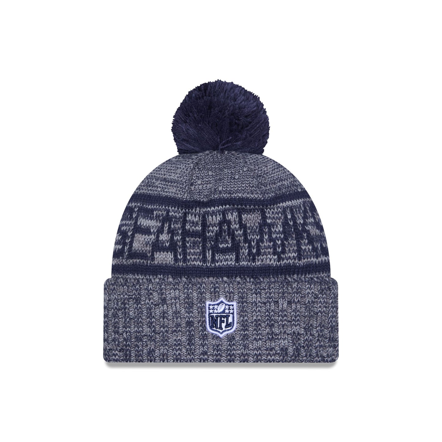 The Seattle Seahawks 2025 Sideline Cold Weather Gray Pom Knit Hat features a sewn-down silicone Seahawks white logo patch at the front cuff with a matching Official NFL Shield logo at the rear. Additional details include a team wordmark across the crown, a one-time removeable pom, and a fleece lining.