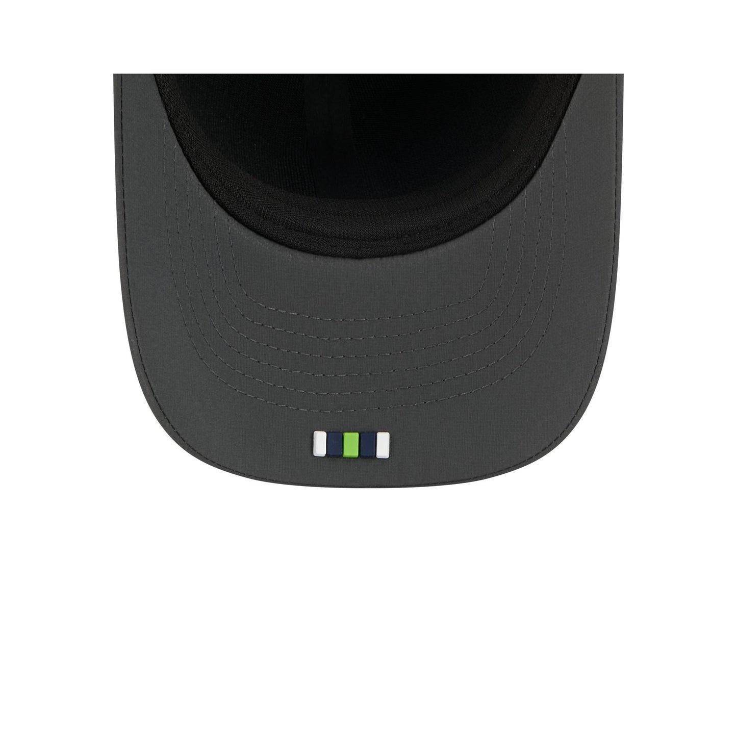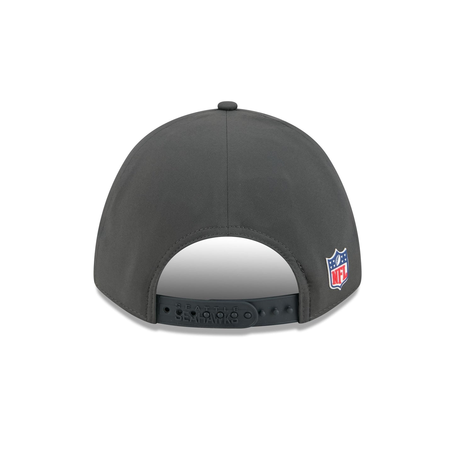 The Seattle Seahawks 2025 Sideline Cold Weather Steel Clouds 9FORTY M-Crown Snapback features a sewn-down silicone Seahawks logo patch at the front panels with a water-repellent quill tech fabrication throughout and a quick-dry cushioned sweatband to absorb moisture. Additional details include the Official NFL Shield logo to the right of a soft silicone snapback closure at the rear. The crown has bonded seams to trap warmth and the undervisor is accented with a silicone transfer in the team’s colors.