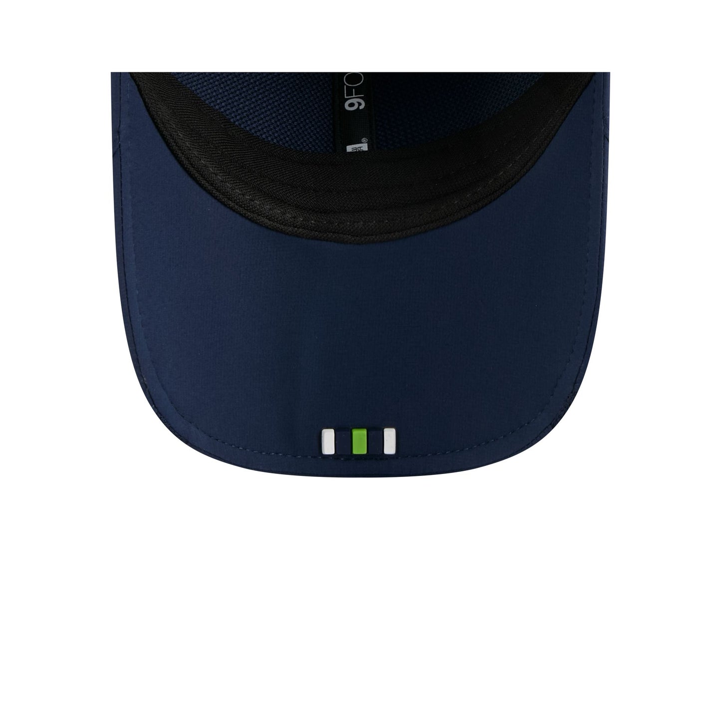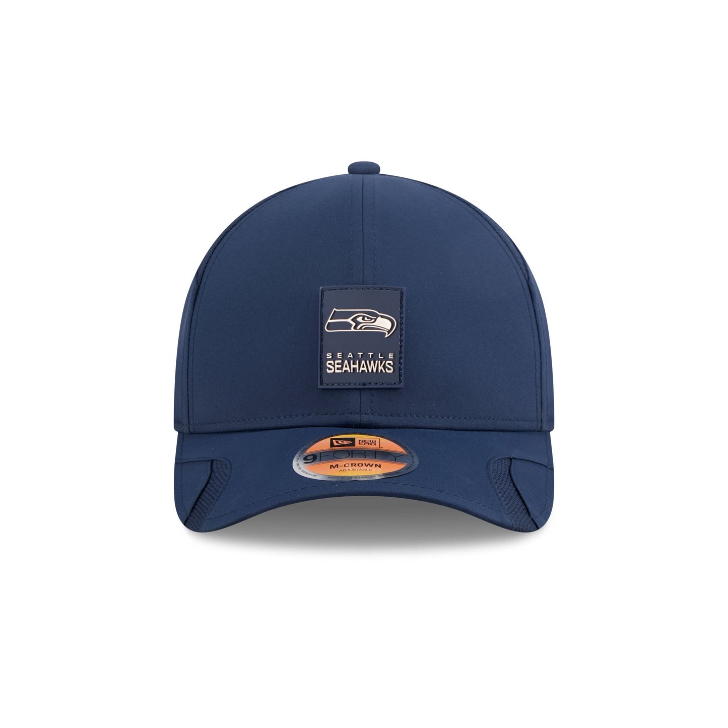 The Seattle Seahawks 2025 Sideline Hot Weather 9FORTY M-Crown Snapback features a sewn-down silicone Seahawks logo patch at the front panels with a water-repellent quill tech fabrication throughout and a quick-dry cushioned sweatband to absorb moisture. Additional details include the Official NFL Shield logo to the right of a soft silicone snapback closure at the rear and mesh accents at the visor sides and side crown panels. The undervisor is accented with a silicone transfer in the team’s colors.