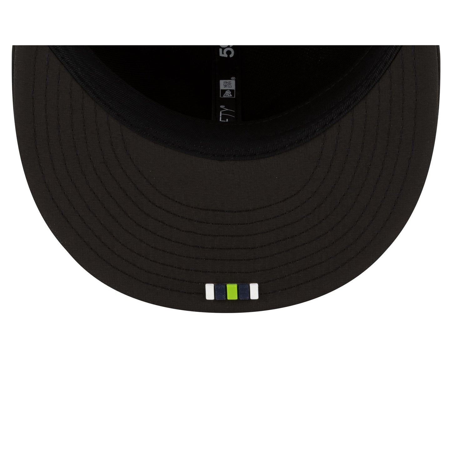 The Seattle Seahawks 2025 Sideline Hot Weather Black 59FIFTY Fitted Cap features a sewn-down silicone Seahawks logo patch at the front panels with the Official NFL Shield logo at the rear. The cap has a water-repellent quill tech fabrication throughout, with a quick-dry cushioned sweatband to absorb moisture. The undervisor is accented with a silicone transfer in the team’s colors.