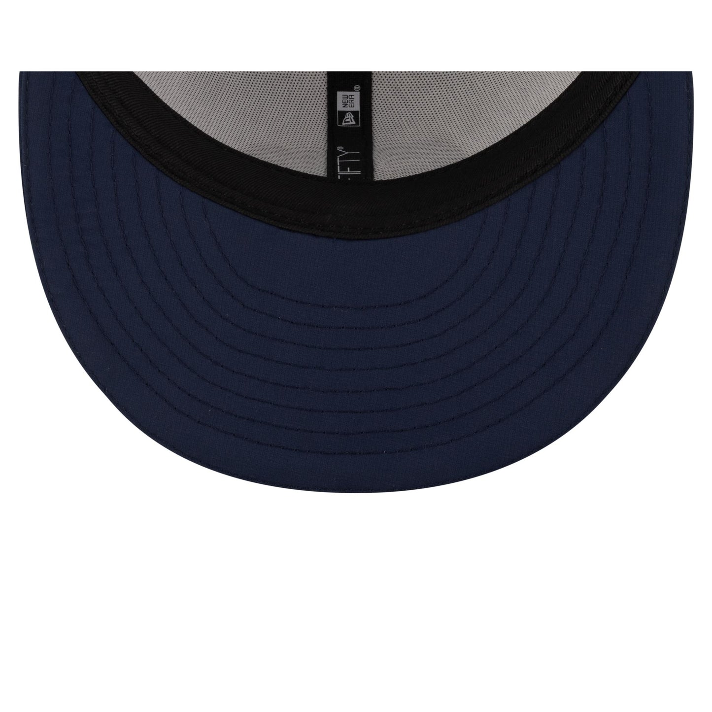 The Seattle Seahawks 2025 Training 59FIFTY Fitted Cap features a silicone Seahawks patch at the front panels with team color stripes at the front of a navy visor and a silicone NFL Shield patch at the rear.