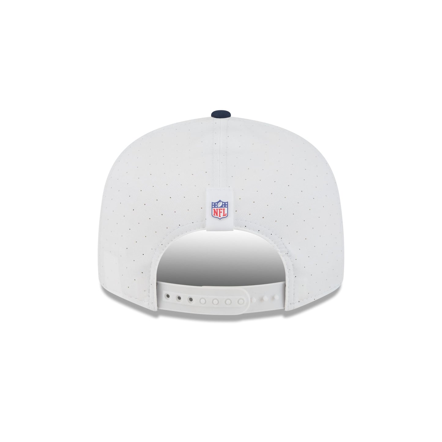 The Seattle Seahawks 2025 Training Split Panel 9FIFTY Snapback features a silicone Seahawks patch at the front panel with team color stripes at the front of a navy visor. Additional details include a silicone NFL Shield patch on a woven foldover tab above a snapback closure at the rear.