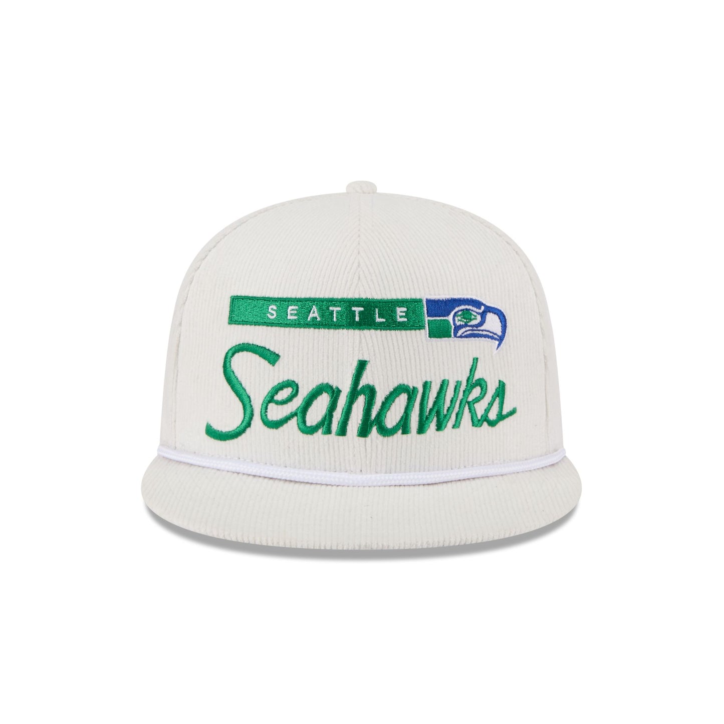 The Seattle Seahawks Corduroy Rope 9FIFTY Snapback features an embroidered Seahawks Historic graphic at the front panels with a corduroy fabrication throughout. Additional details include a rope at the visor, an adjustable snapback closure at the rear, and a gray undervisor.