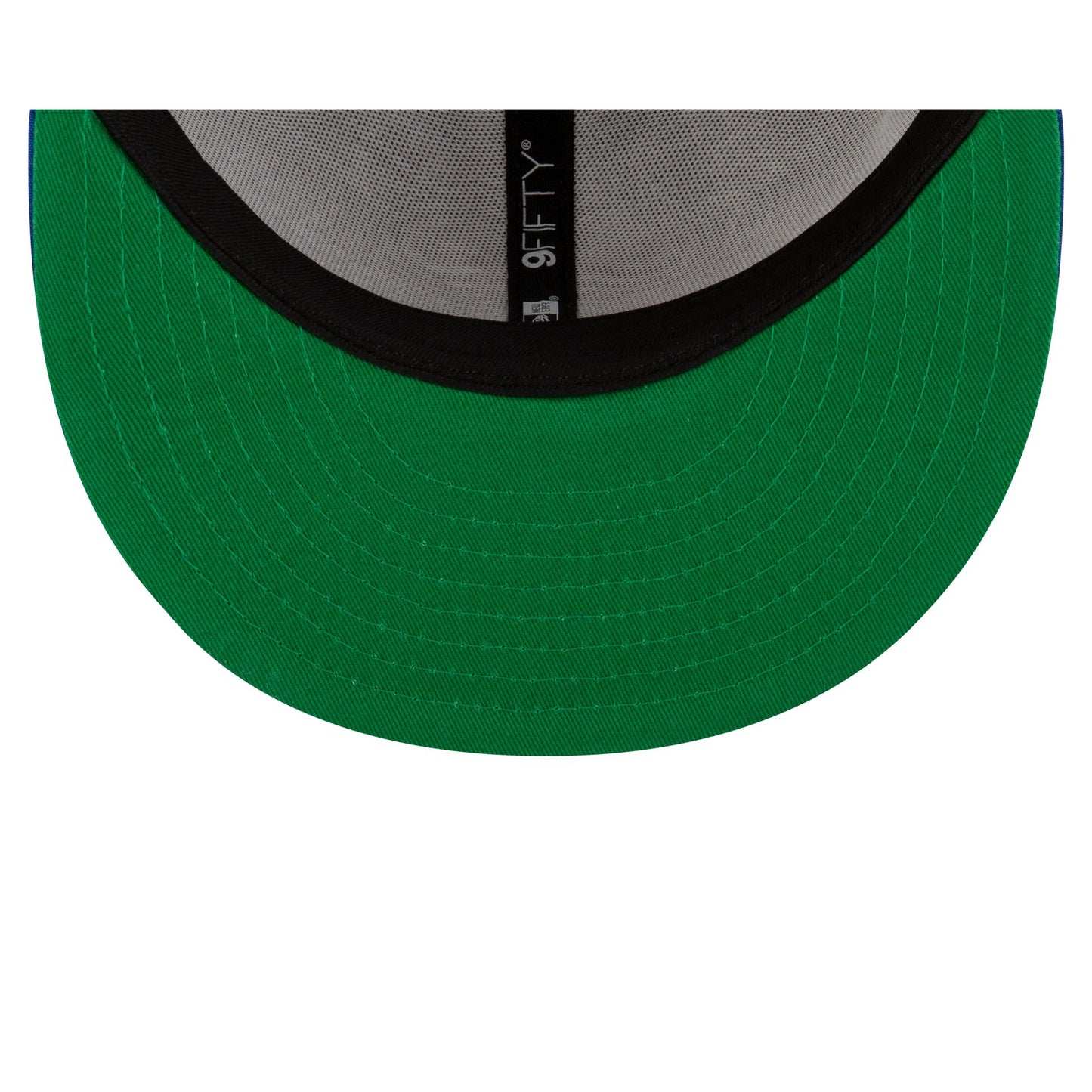 The Seattle Seahawks Historic Helmet Pack 9FIFTY Snapback features an embroidered fabric applique Seahawks replica helmet design at the crown with a matching woven team logo tag at an adjustable snapback closure at the rear and a green undervisor.