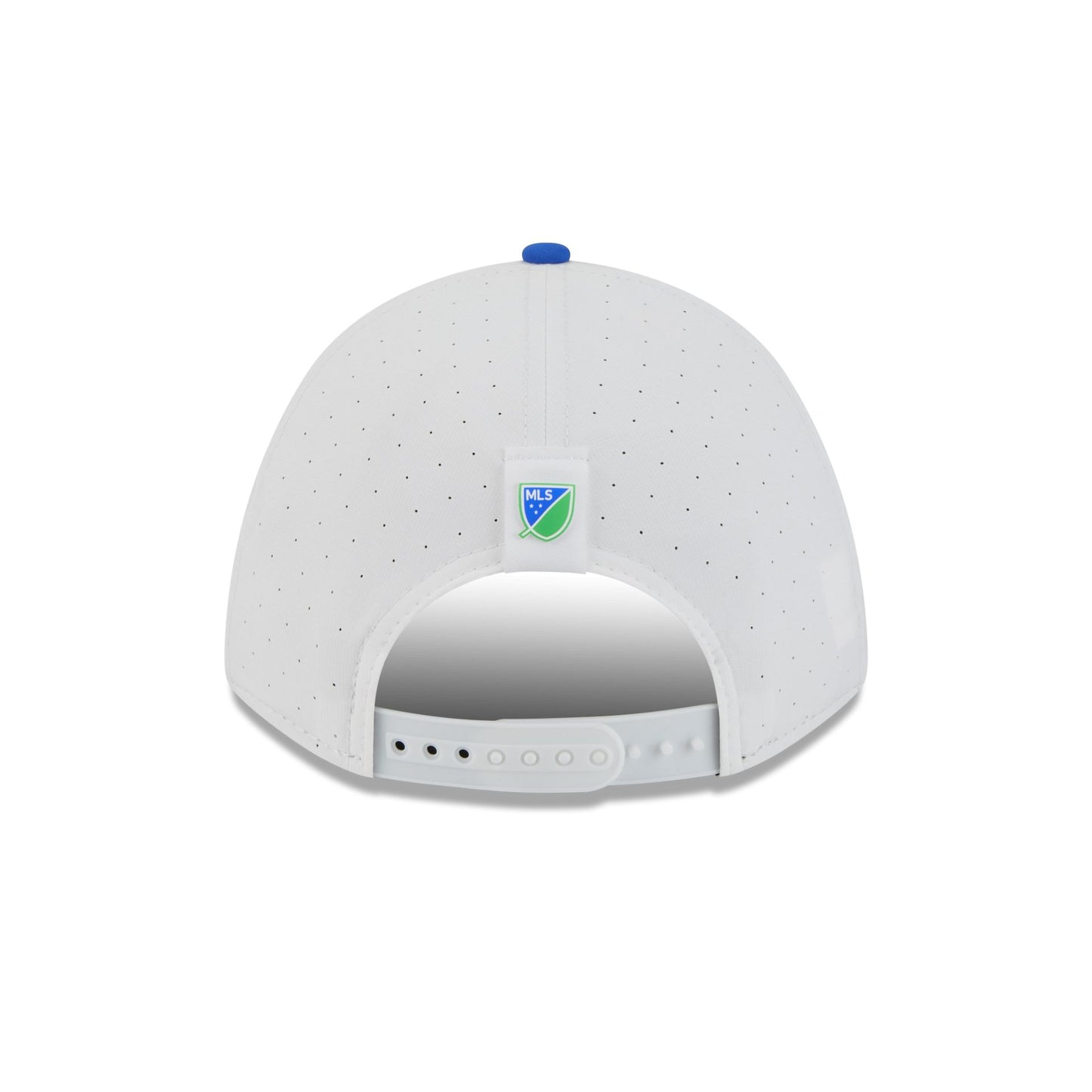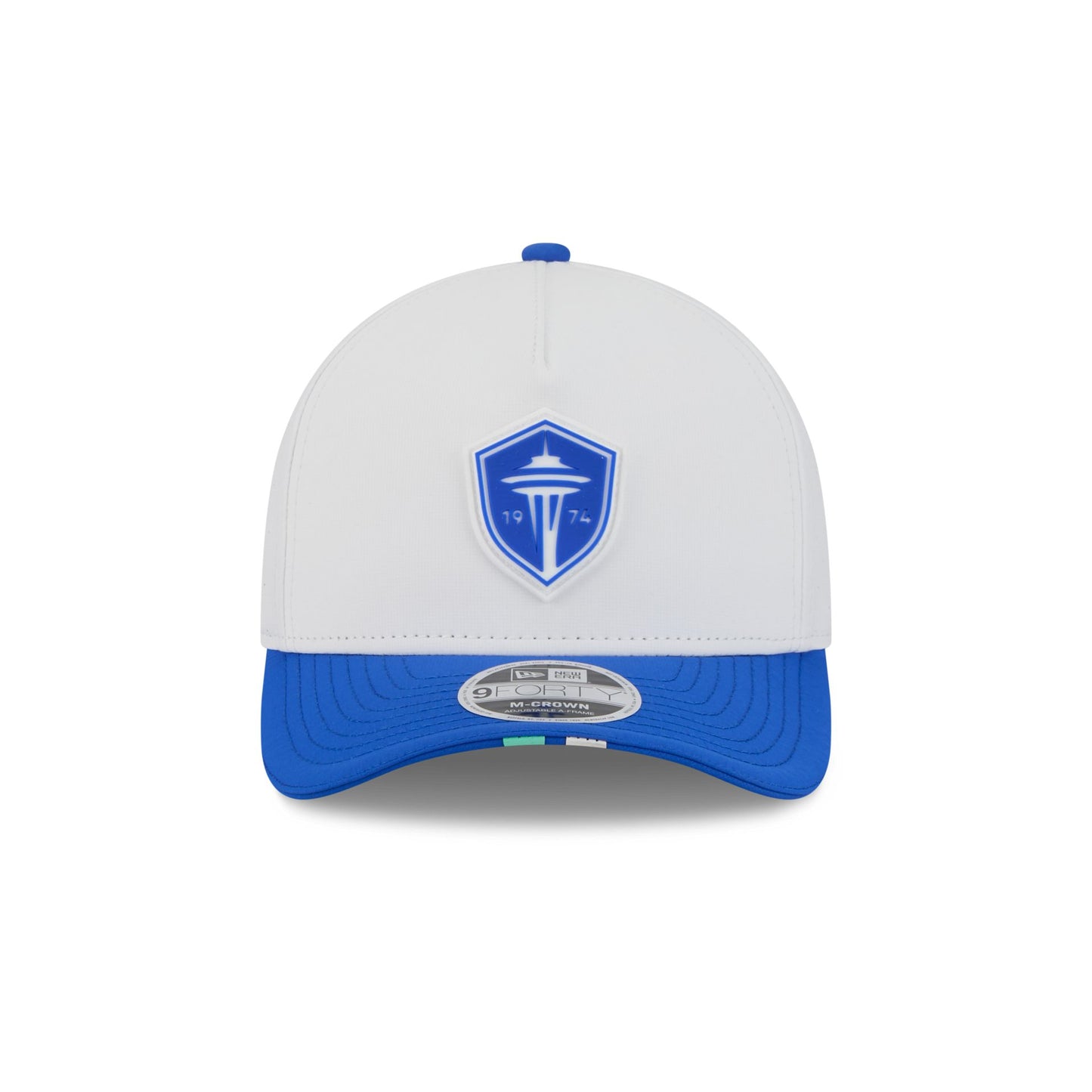 The Seattle Sounders 2026 MLS Kickoff 9FORTY M-Crown A-Frame Snapback features a stitch-down silicone Sounders logo patch at the front panel with a matching woven MLS Shield tag above a snapback closure at the rear. Additional details include a quill tech performance fabrication with a blue visor accented with team color stripes at the front.