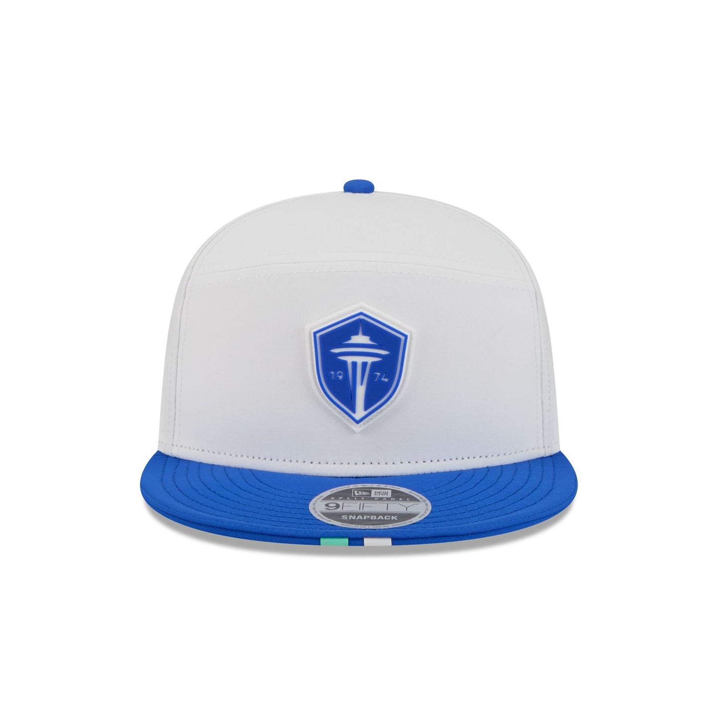 The Seattle Sounders 2026 MLS Kickoff Split Panel 9FIFTY Snapback features a stitch-down silicone Sounders logo patch at the front panel with a matching woven MLS Shield tag above a snapback closure at the rear. Additional details include a quill tech performance fabrication with a blue visor accented with team color stripes at the front.