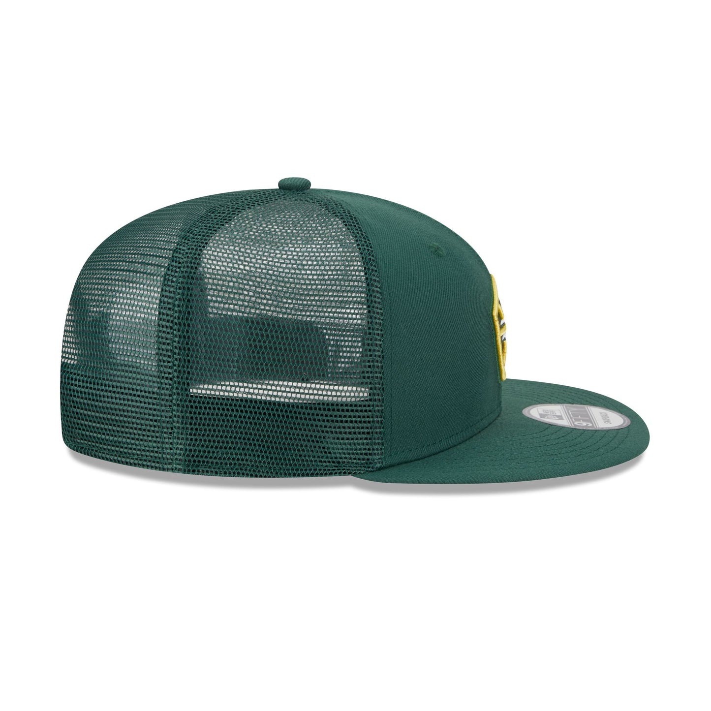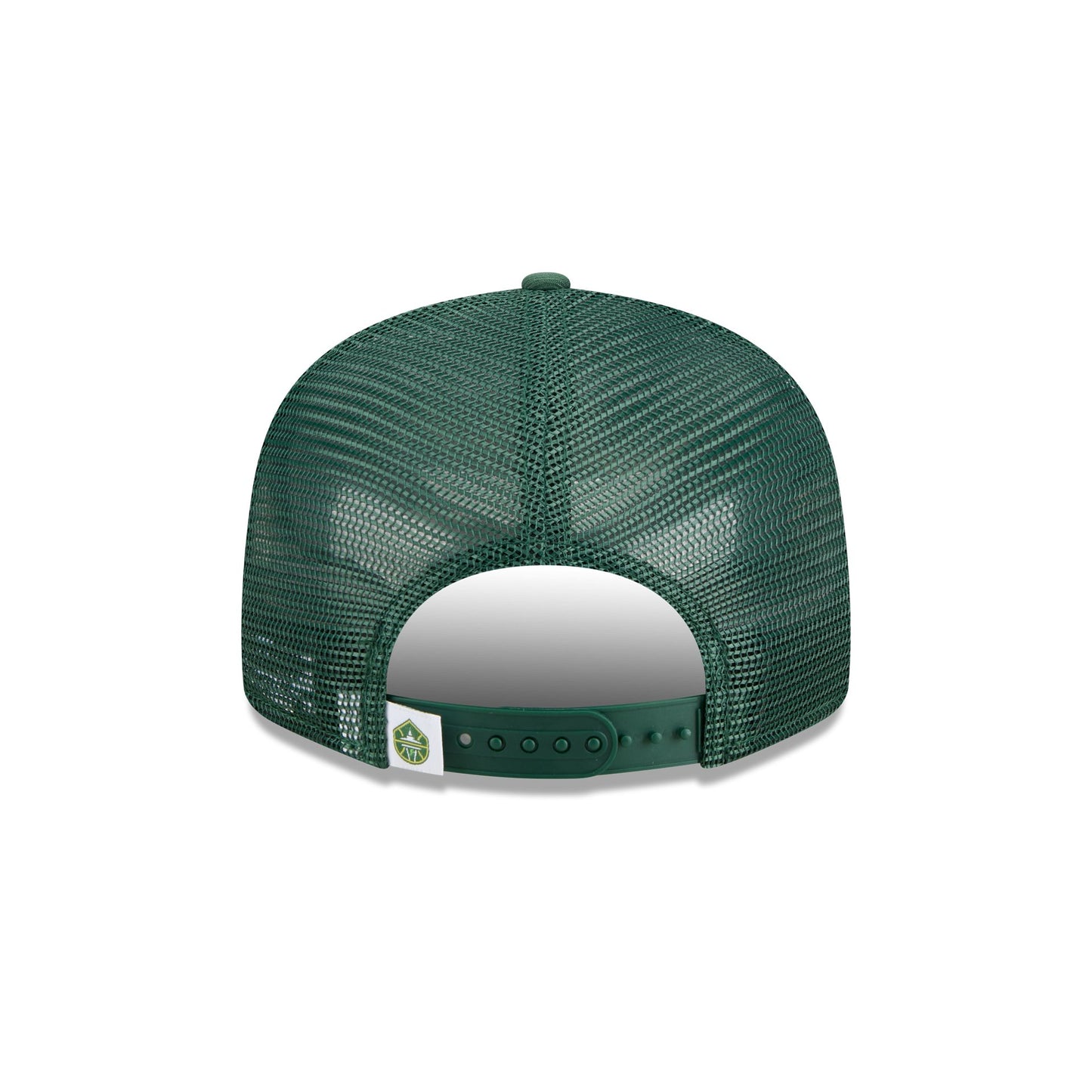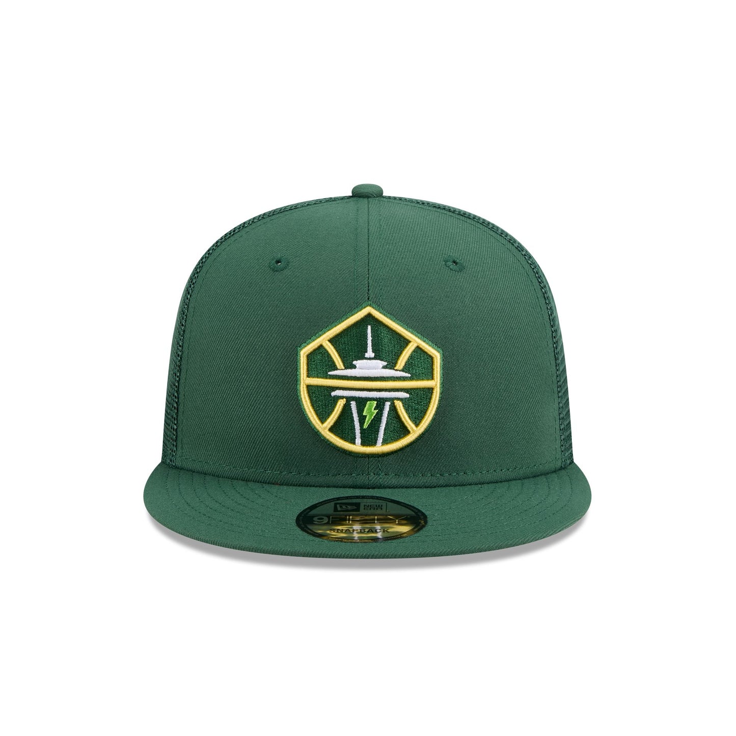 The Seattle Storm 9FIFTY Trucker features an embroidered Storm logo at the front panels with a matching woven team tag at a snapback closure at the rear and a gray undervisor.