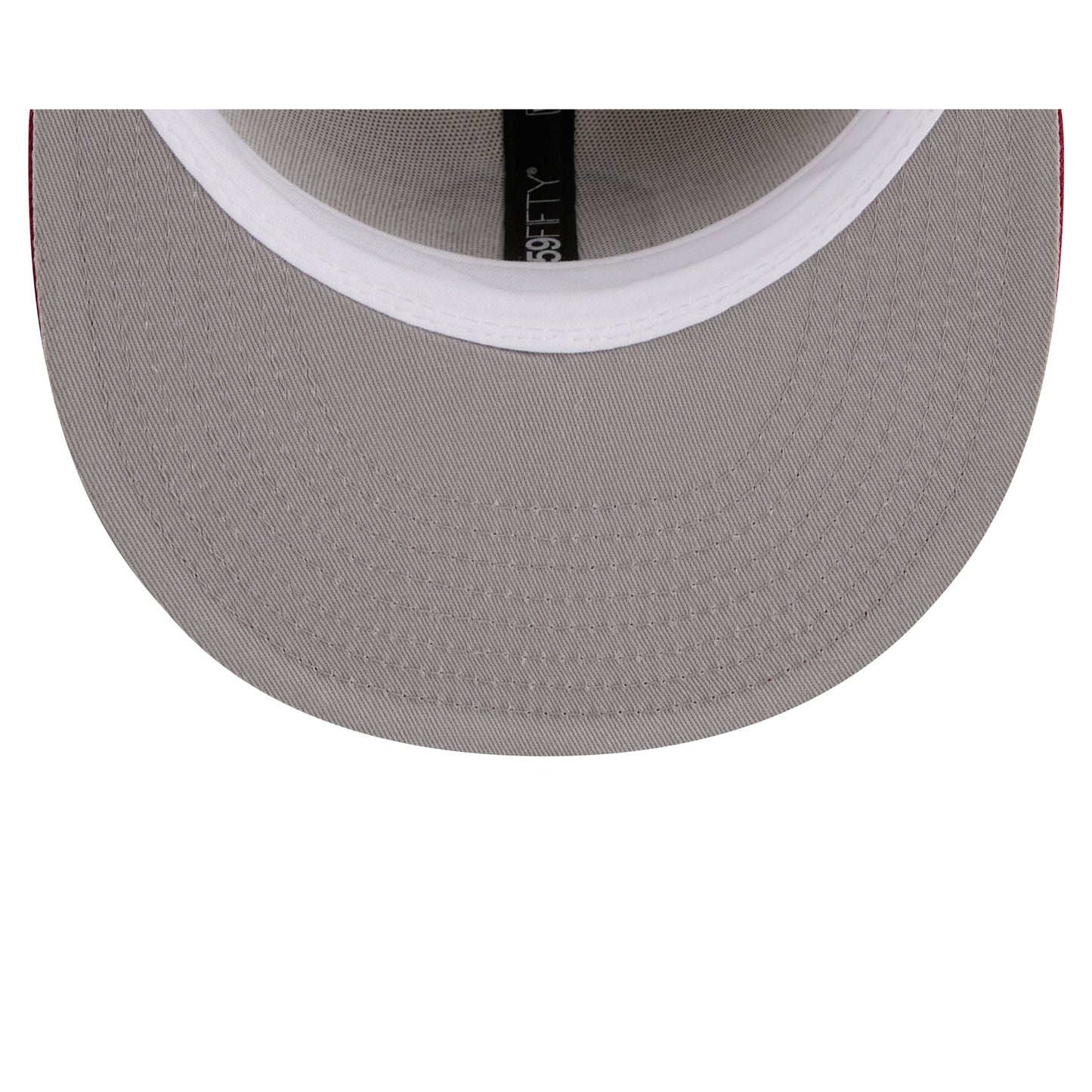 The South Carolina Gamecocks Collegiate Two-Tone Chrome 59FIFTY Fitted Cap features an embroidered Gamecocks logo at the front panels with an alternate team logo at the rear. Additional details include a 2017 NCAA Final Four patch at the right-wear side with a red visor and a gray undervisor.