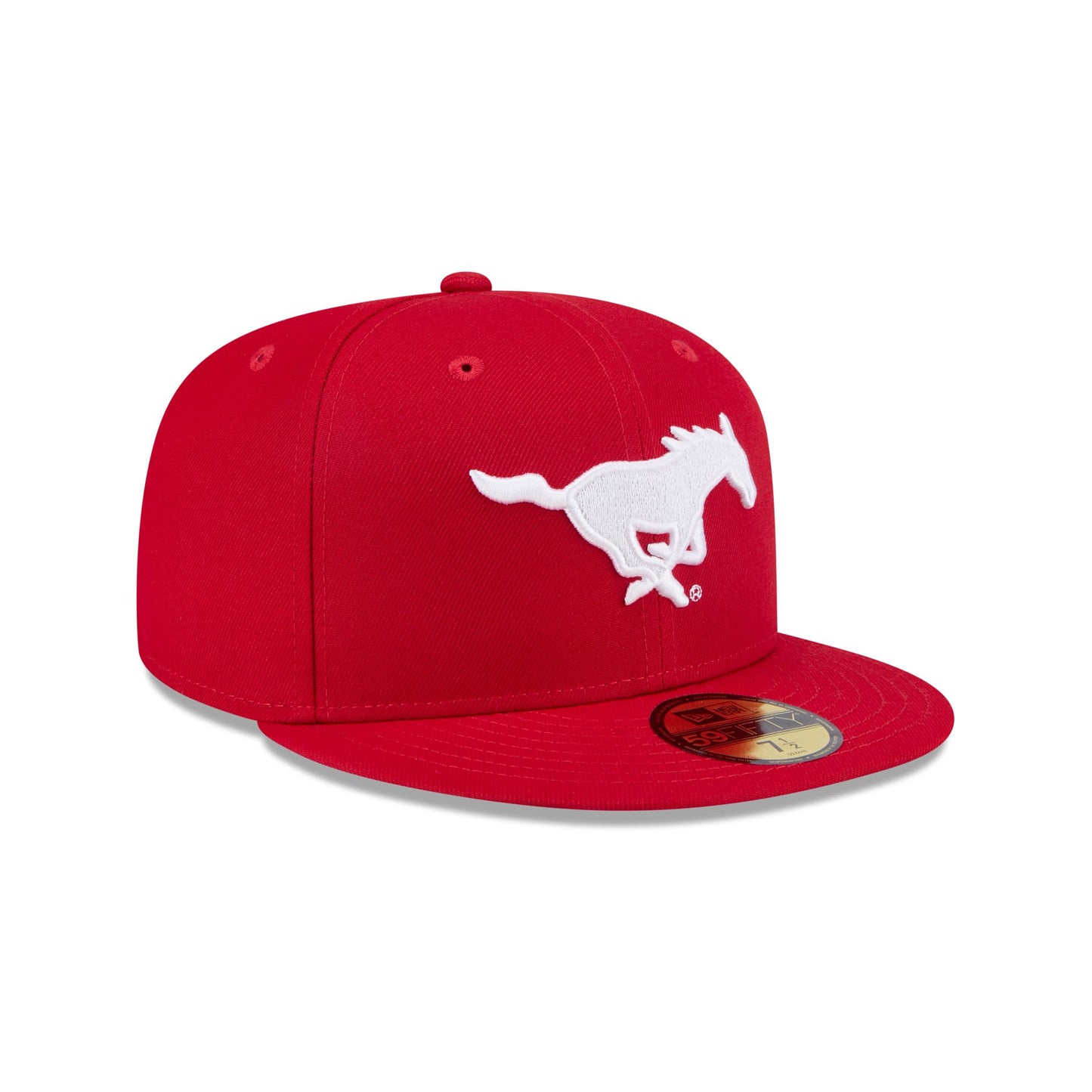 The Southern Methodist Mustangs Go-To 59FIFTY Fitted Cap features an embroidered Mustangs logo at the front panels with a matching team wordmark at the rear and a gray undervisor.