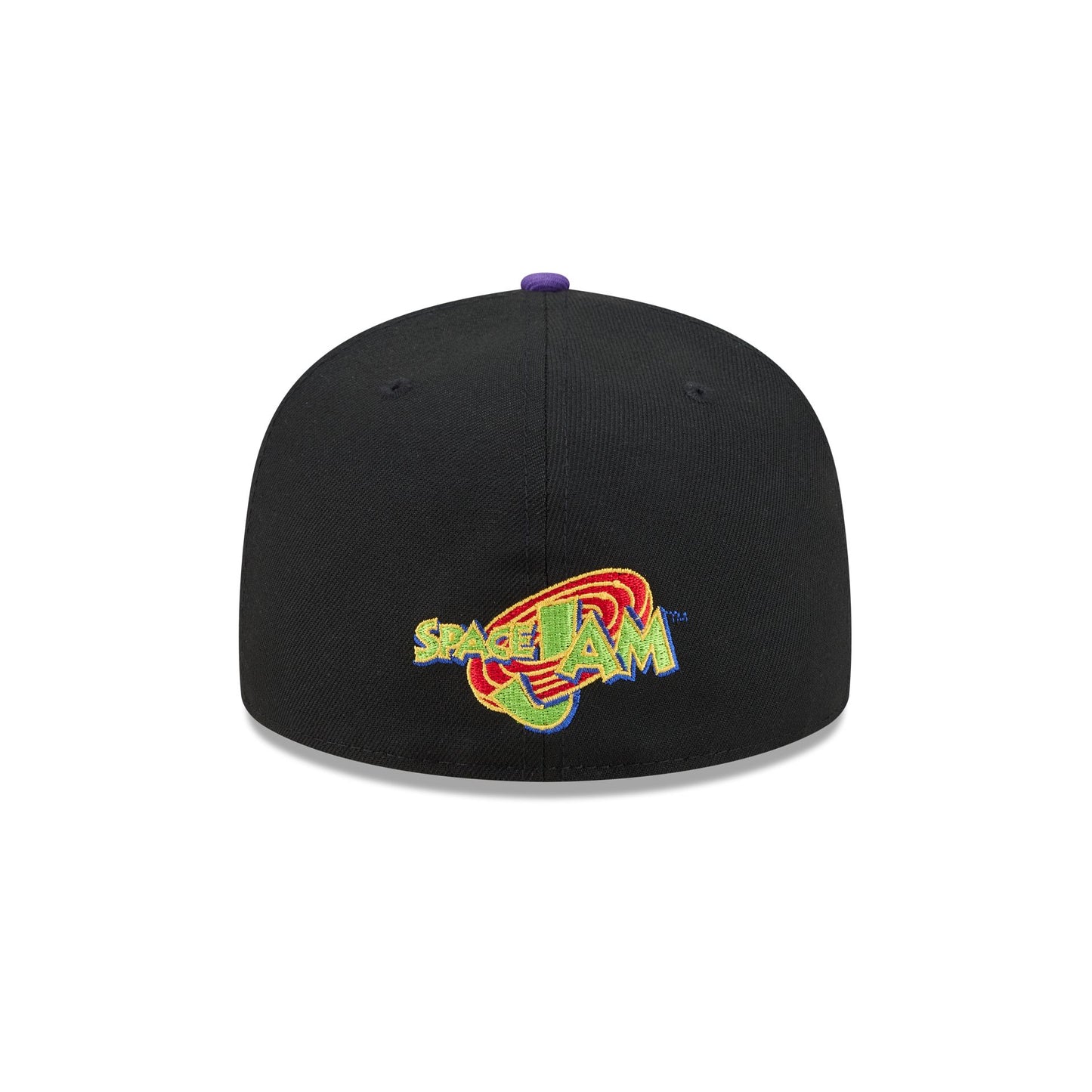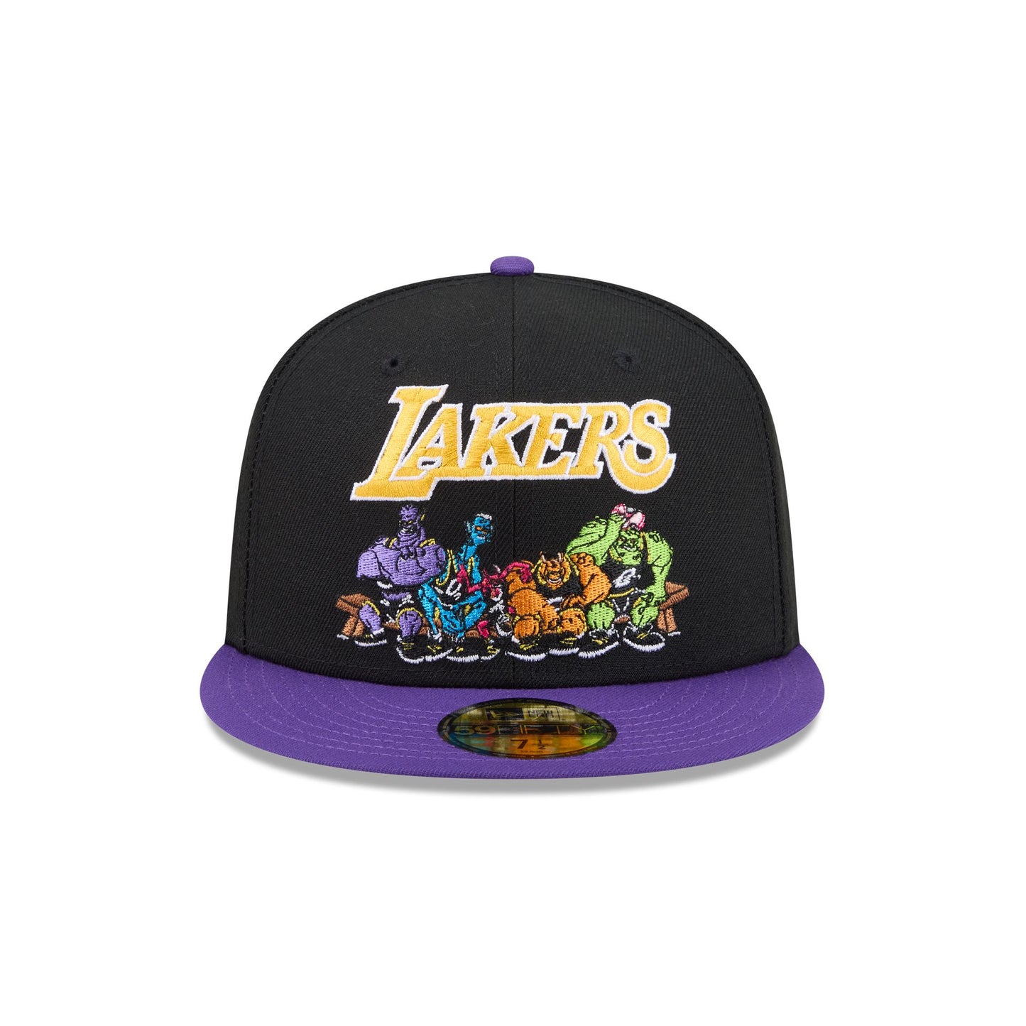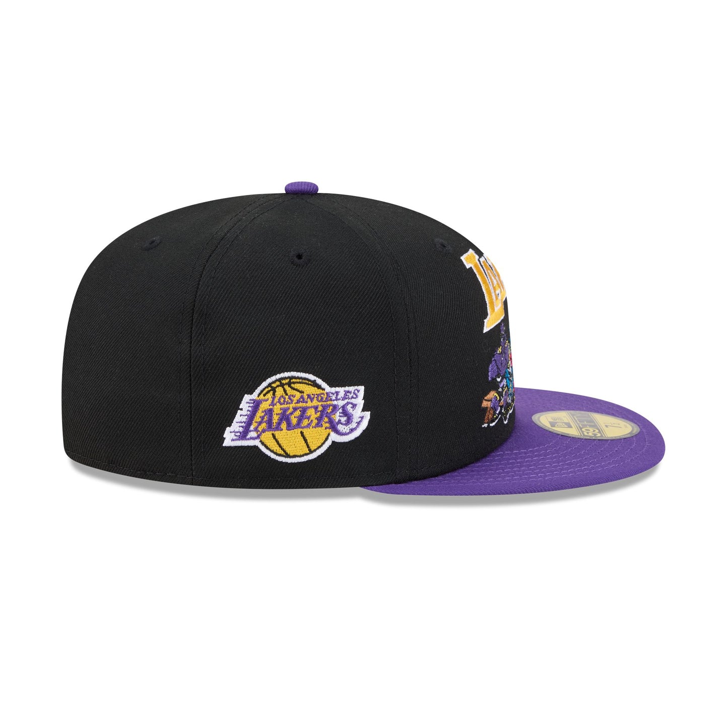 The Space Jam x Los Angeles Lakers Monstars Black 59FIFTY Fitted Cap features an embroidered Lakers wordmark and Monstars graphic at the front panels and a team logo at the right-wear side. Additional details include a Space Jam logo at the rear and a gray undervisor.