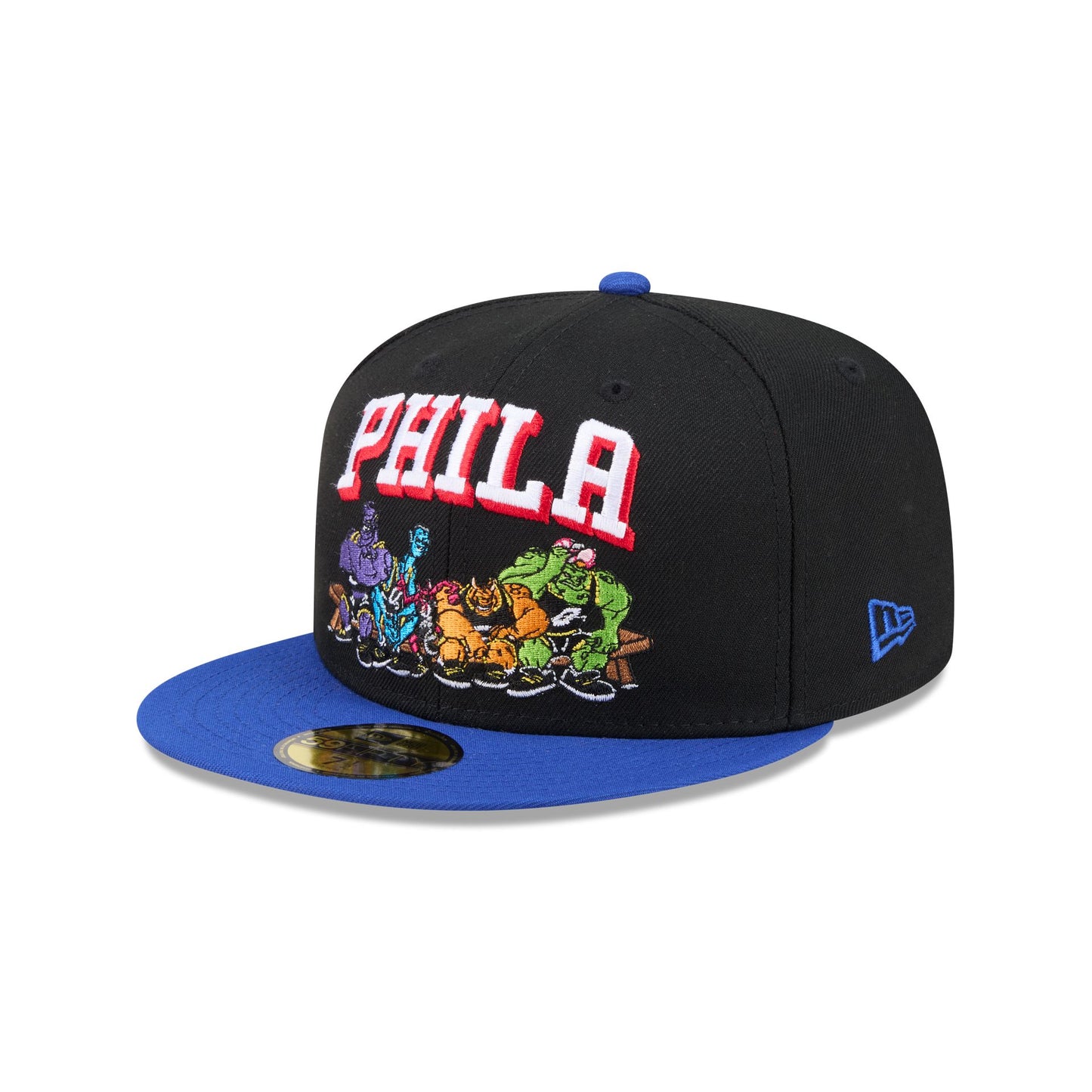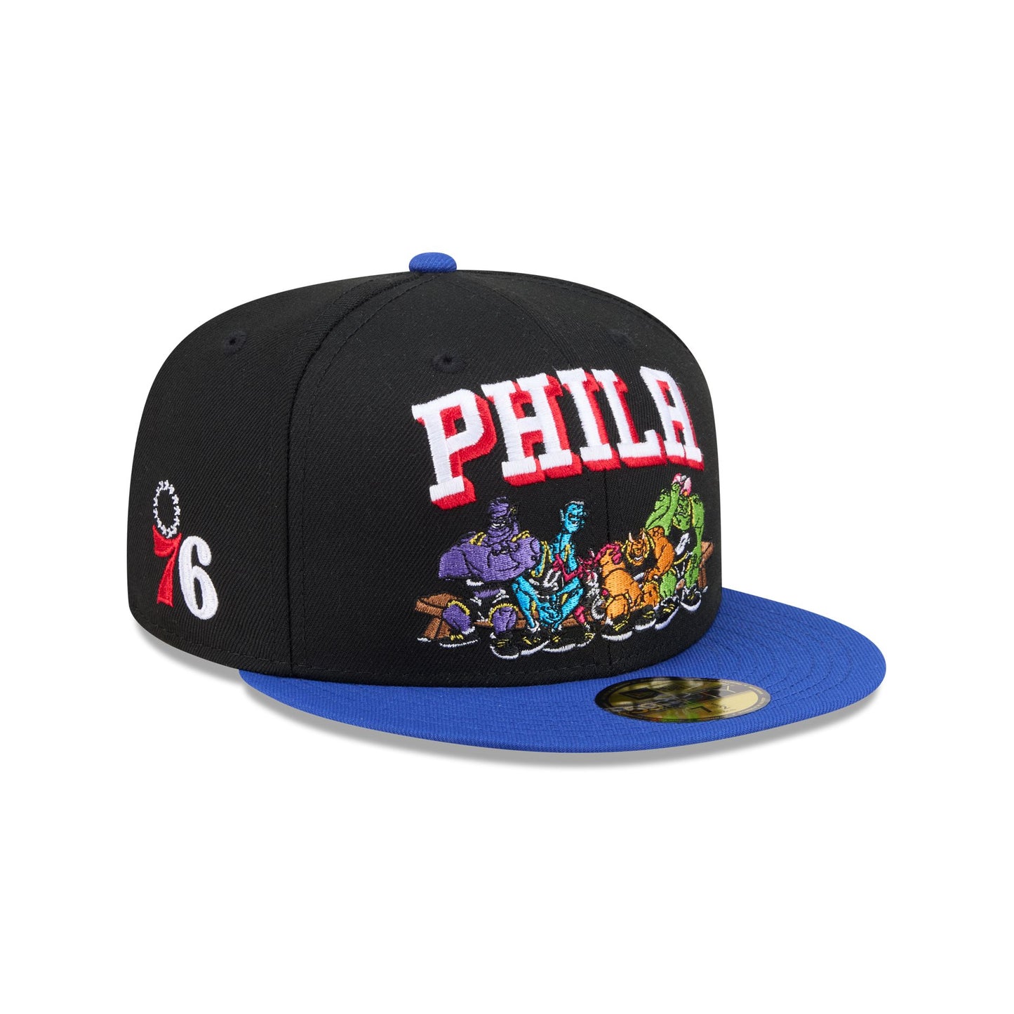 The Space Jam x Philadelphia 76ers Monstars Black 59FIFTY Fitted Cap features an embroidered 76ers wordmark and Monstars graphic at the front panels and a team logo at the right-wear side. Additional details include a Space Jam logo at the rear and a gray undervisor.