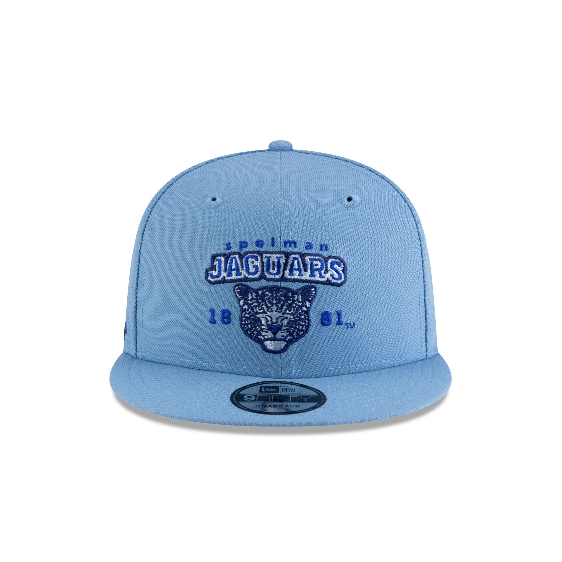 The Spelman Jaguars Sky Blue 9FIFTY Snapback Cap features an embroidered Jaguars logo at the front panels with a team wordmark at the right-wear side, a snapback closure at the rear, and a gray undervisor.