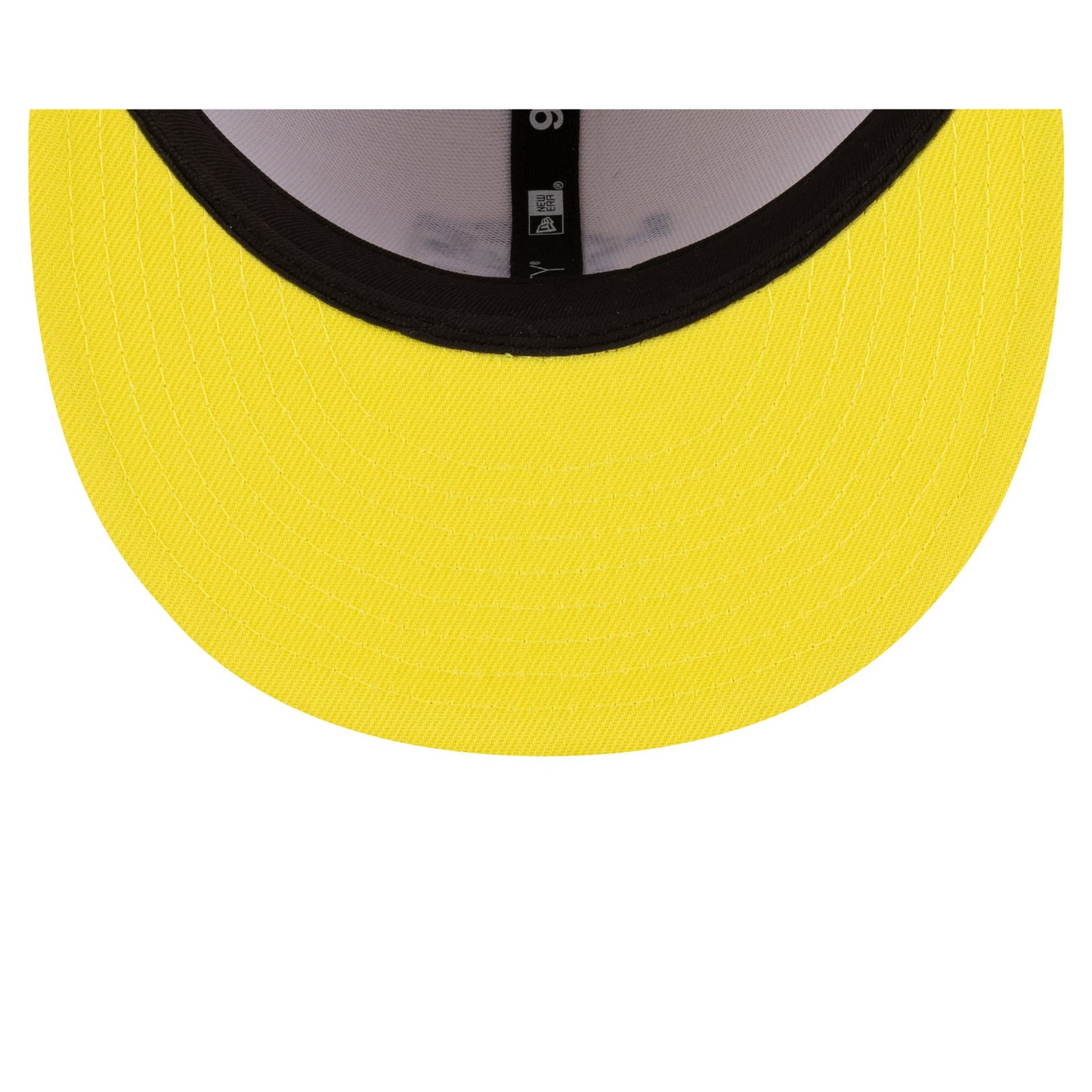 The SpongeBob SquarePants 25th Anniversary 9FIFTY Snapback features an embroidered SpongeBob character graphic at the front panels with a 25th Anniversary patch at the right-wear side. Additional details include a yellow undervisor and an adjustable snapback closure at the rear.