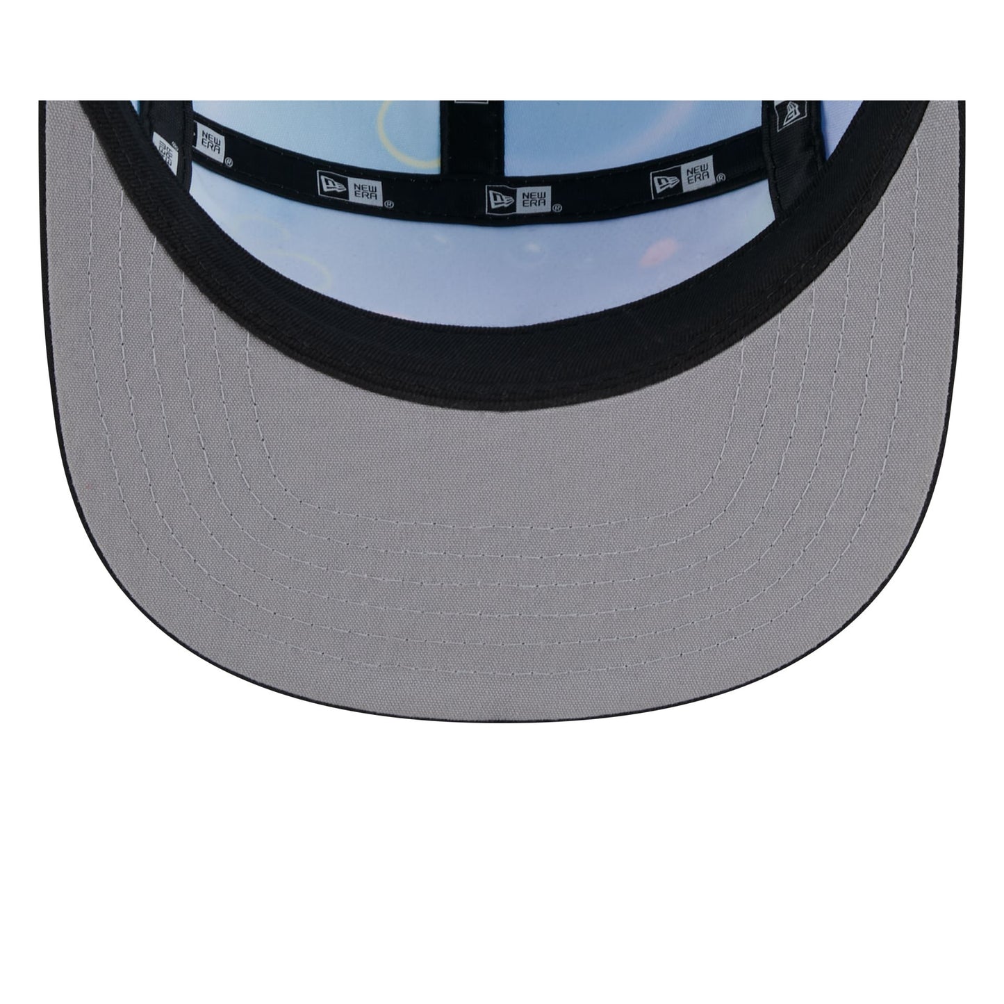 The SpongeBob SquarePants Jellyfish Camper features a jellyfish print crown with an embroidered SpongeBob patch at the right-wear side, a gray undervisor, and a strapback closure at the rear.