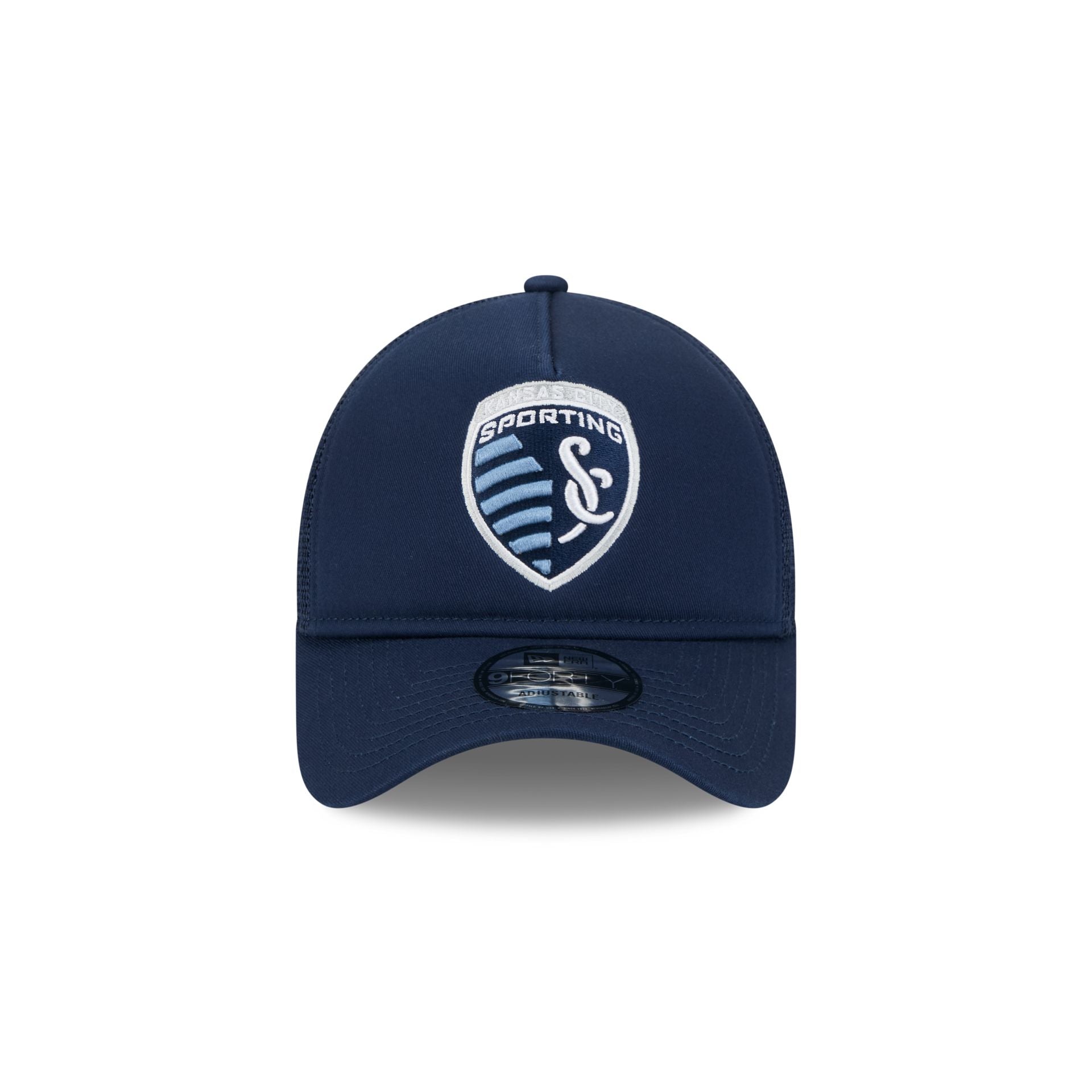 The Sporting Kansas City Team 9FORTY A-Frame Snapback features an embroidered Sporting Kansas City logo at the front panels with a mesh back and a snapback closure at the rear.