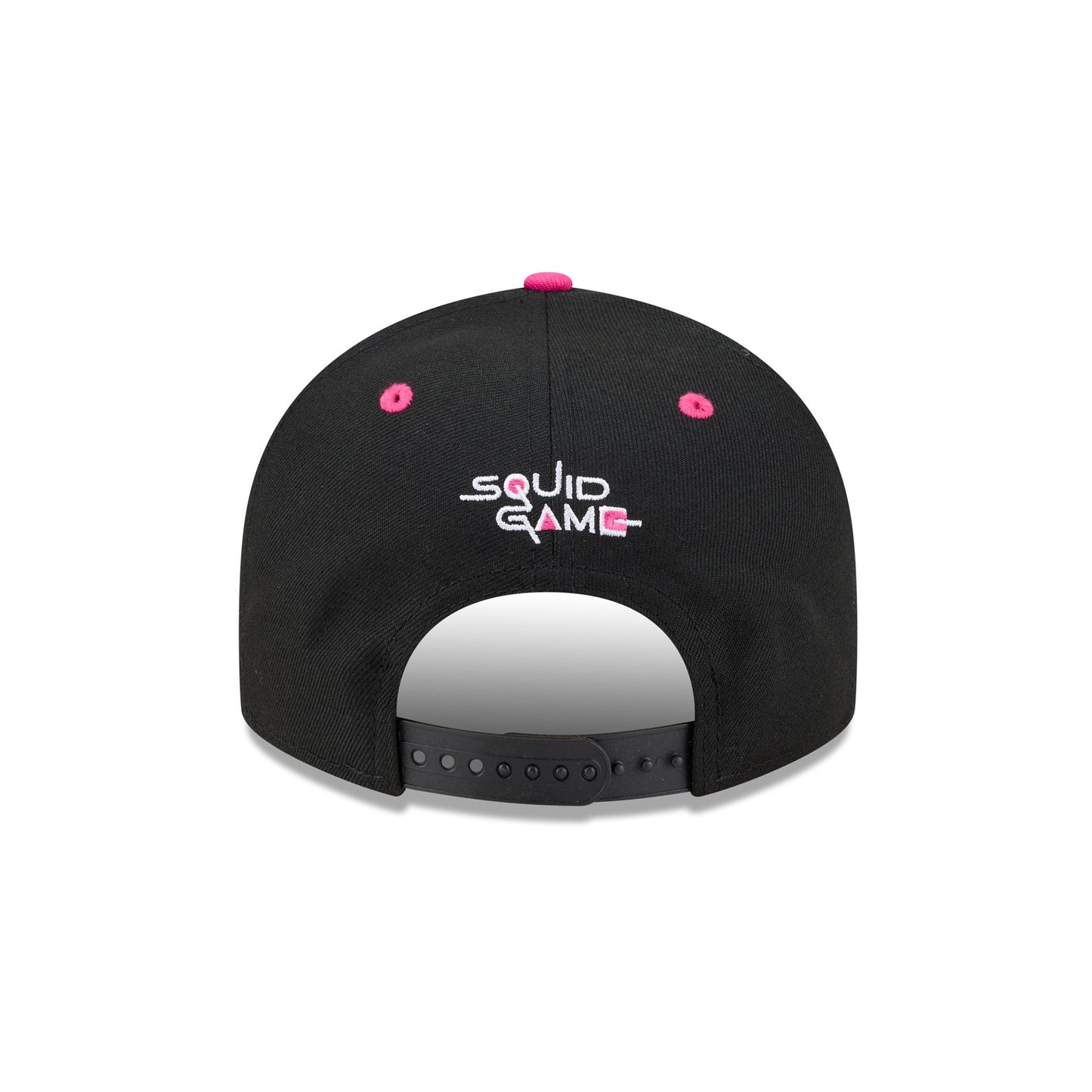 The Squid Game Soldier Symbol 9FIFTY Snapback features an embroidered Squid Game soldier symbol at the front panels with a Squid Game logo above an adjustable snapback closure at the rear. This cap comes with a pre-curved visor.