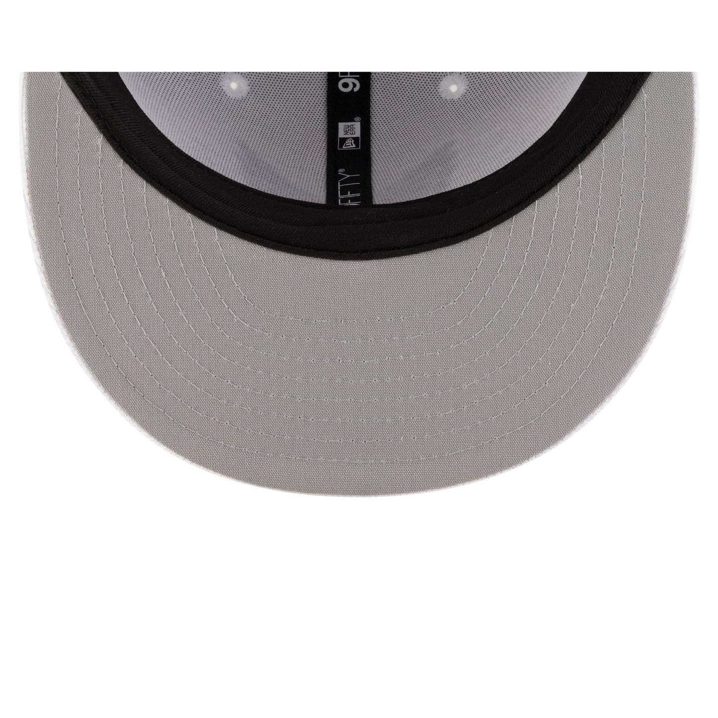 The St. Louis Battlehawks White 9FIFTY Snapback features an embroidered Battlehawks logo at the front panels with the New Era Flag at the left. Additional details include a UFL logo above a snapback closure at the rear and a gray undervisor.