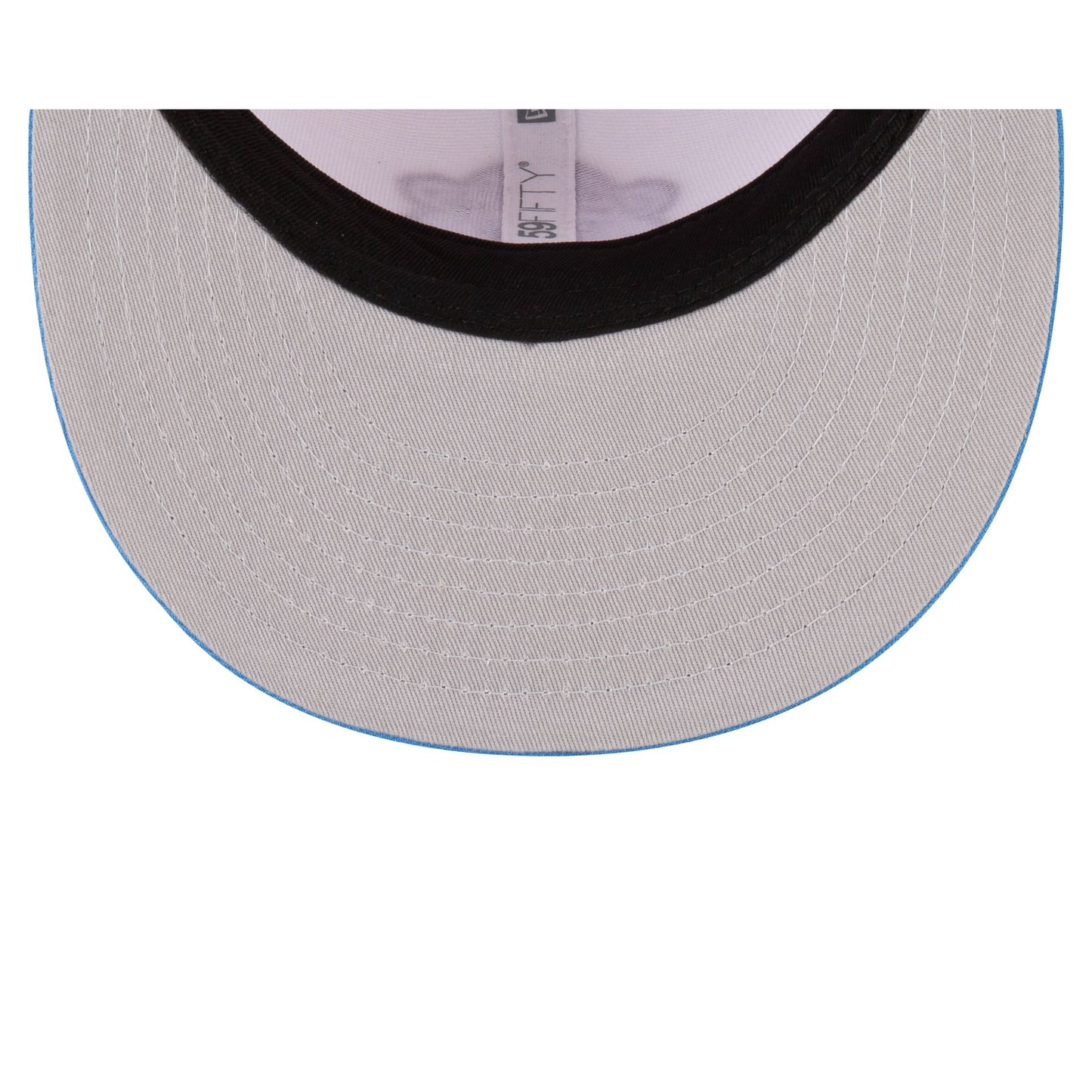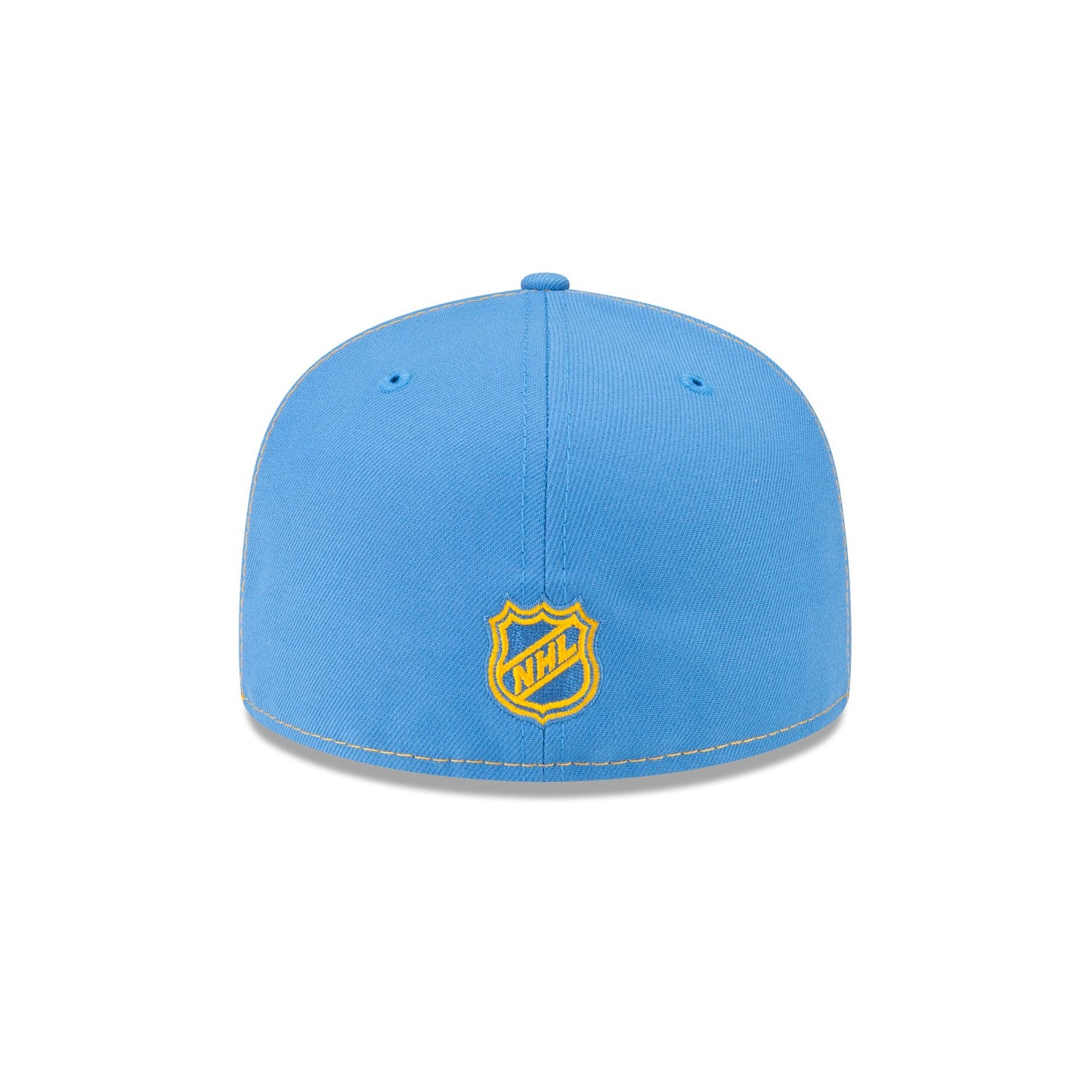 The St. Louis Blues Mascot 59FIFTY Fitted Cap features an embroidered Blues mascot at the front panels with team color paneled crown and a gray undervisor. Additional details include a team logo at the right-wear side with a matching NHL Shield at the rear.