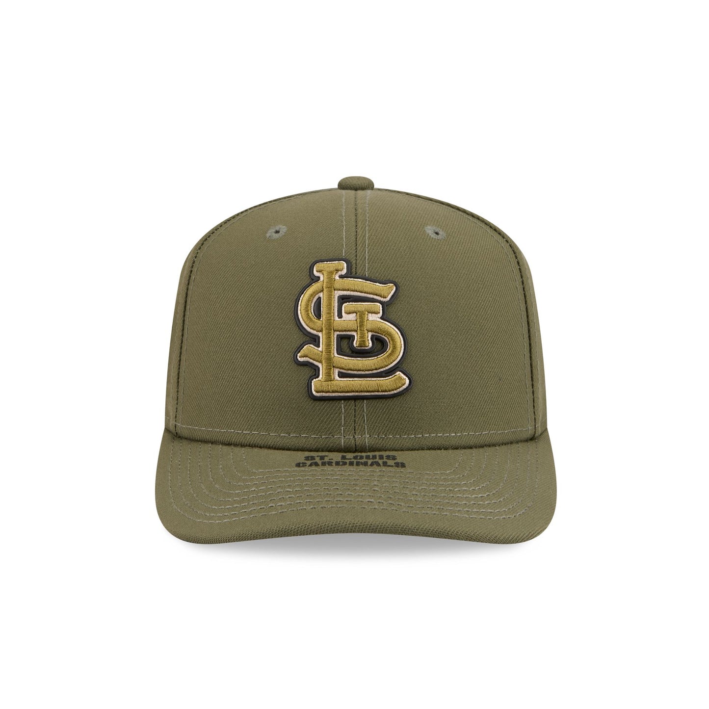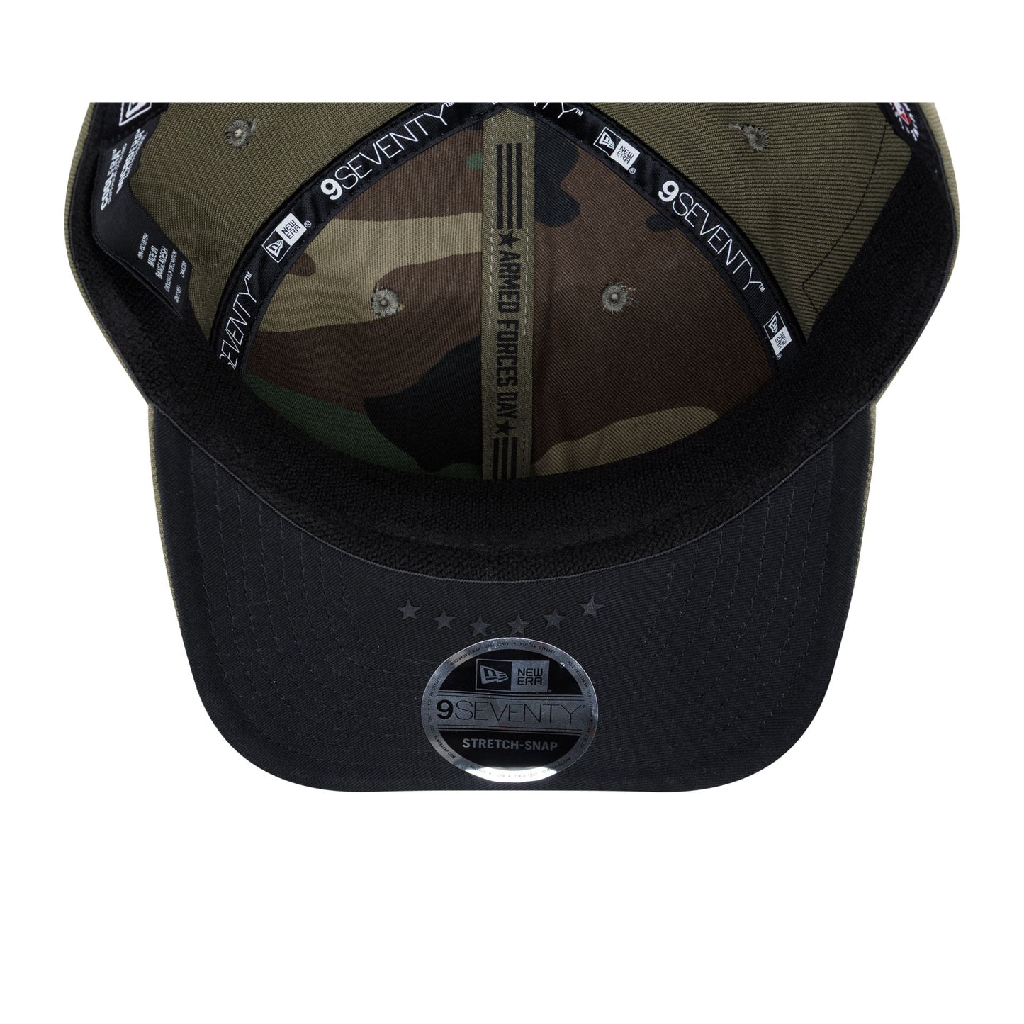 The St. Louis Cardinals Armed Forces Day 2026 9SEVENTY Stretch-Snap Cap features an embroidered Cardinals patch at the front panels with a matching MLB Batterman logo above a stretch-snap closure at the rear and a screen-printed team wordmark at the visor. Additional details include a heat sealed silicone USA flag patch at the right-wear side with screen-printed stars at a black undervisor and camo patterned interior panels.