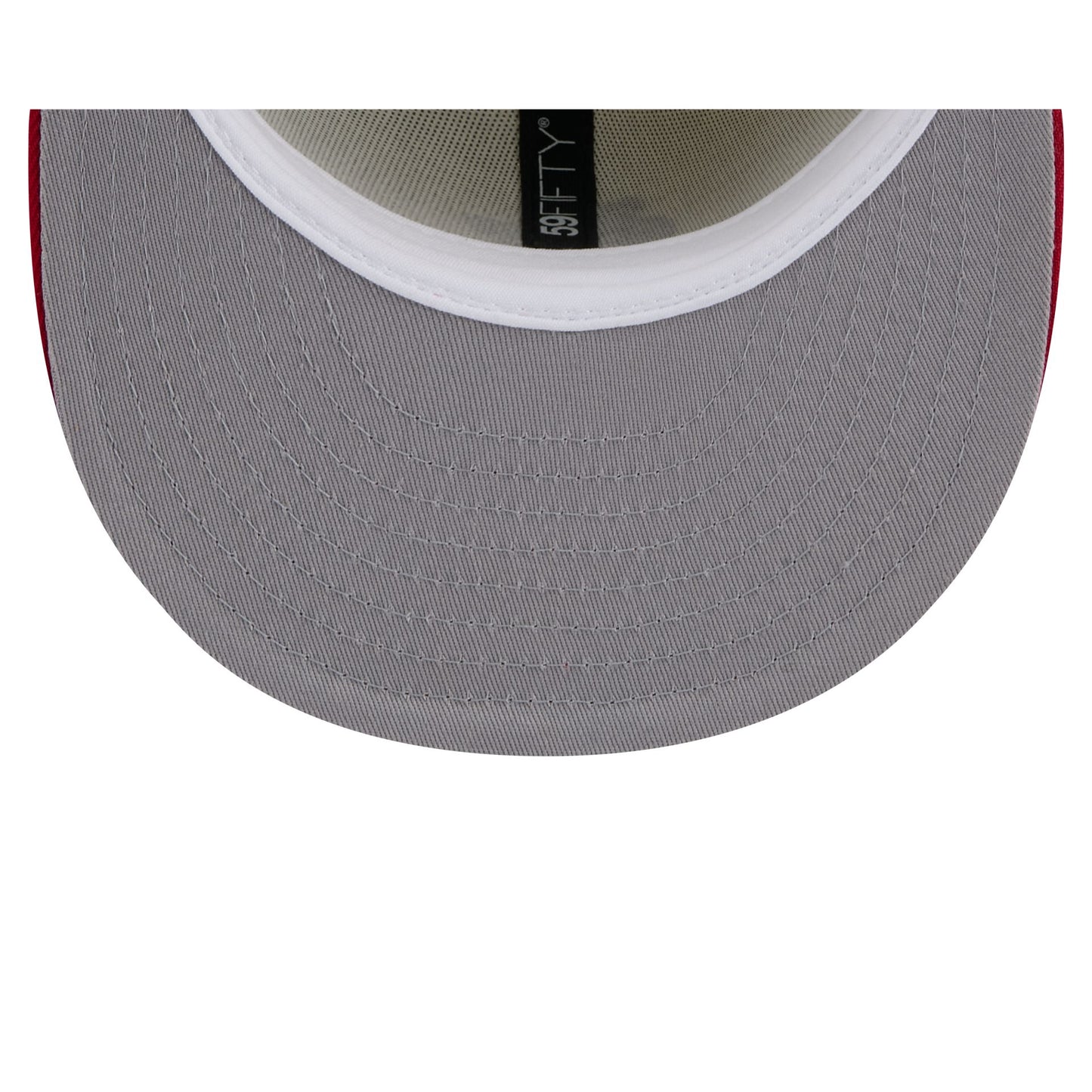 The St. Louis Cardinals Chrome 59FIFTY Fitted Cap features an embroidered Cardinals logo at the front panels with a matching MLB Batterman logo at the rear, a red visor, and a gray undervisor.