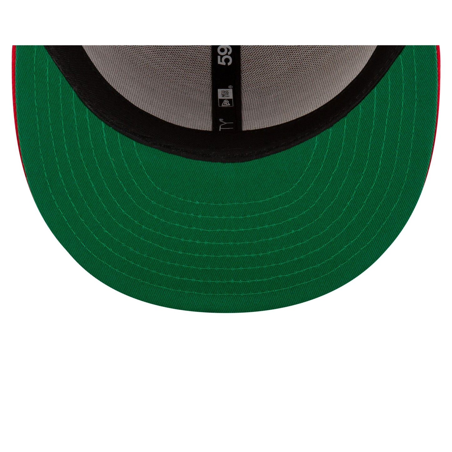 The St. Louis Cardinals Mini Mascot 59FIFTY Fitted Cap features an embroidered Cardinals mascot at the front panels with a matching MLB Batterman logo at the rear. Additional details include a Busch Stadium patch at the right-wear side and a green undervisor.