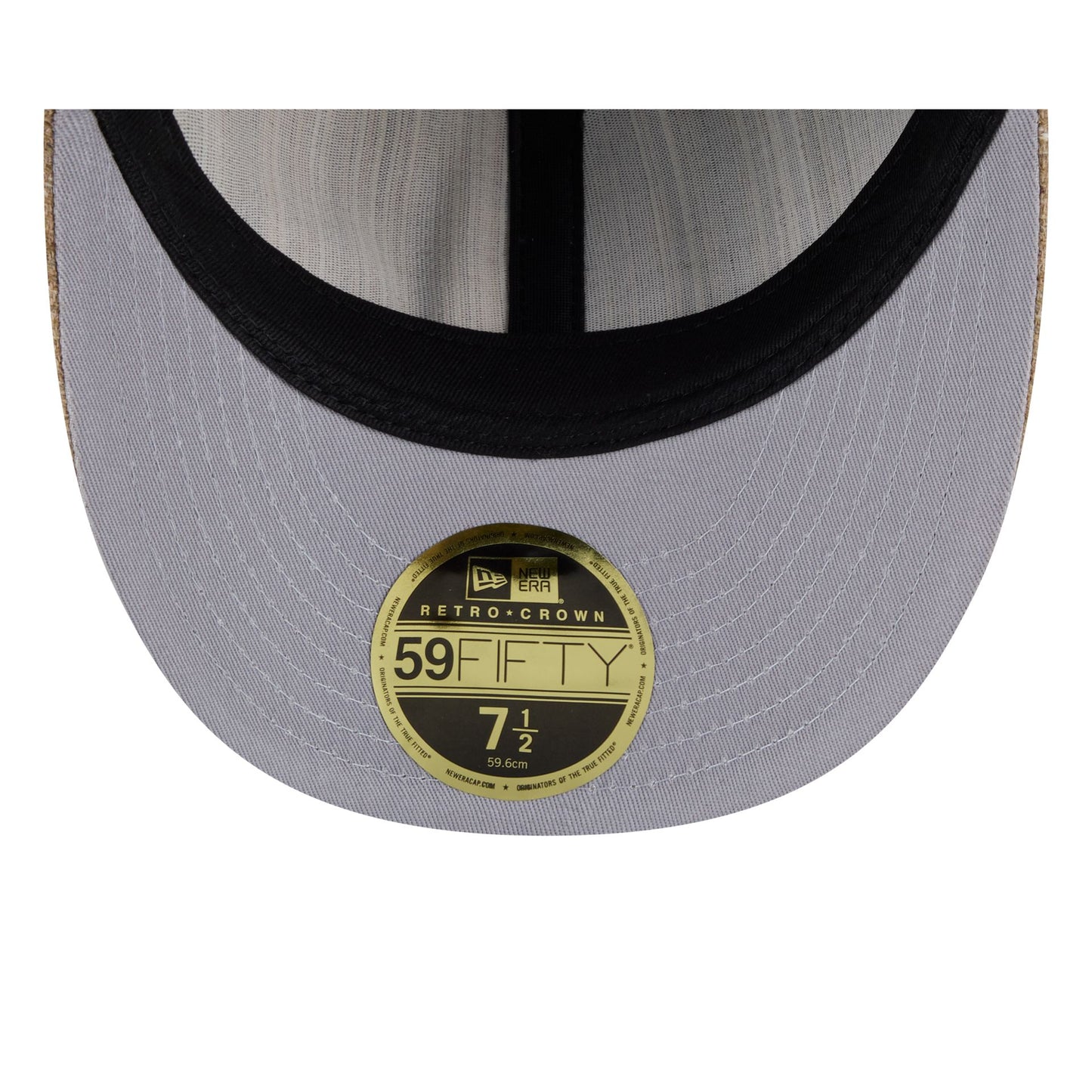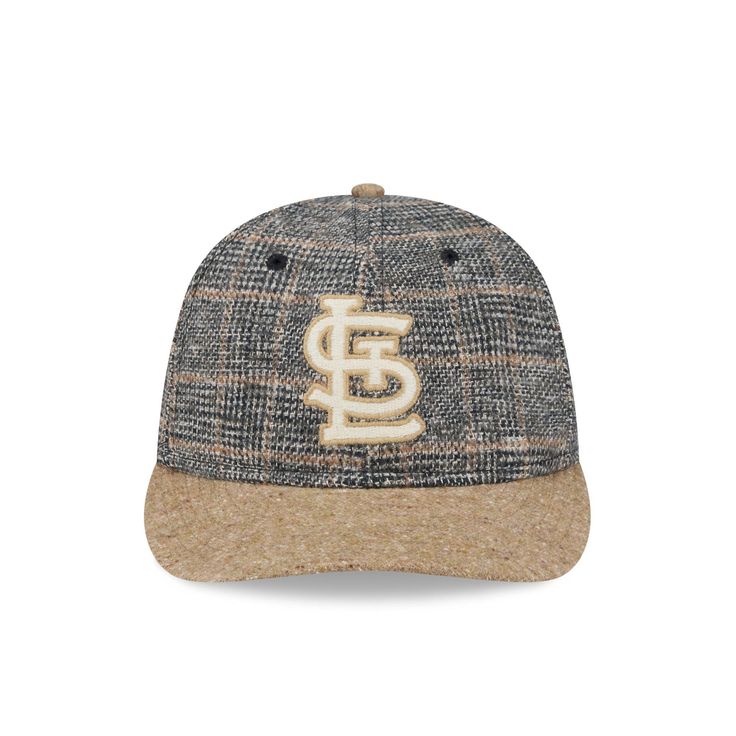 The St. Louis Cardinals Three Looms Vintage Tweed Retro Crown Pre-Curved 59FIFTY Fitted features an embroidered Cardinals logo at the front panels with a matching MLB Batterman logo at the rear, a pre-curved tan visor, and a gray undervisor.